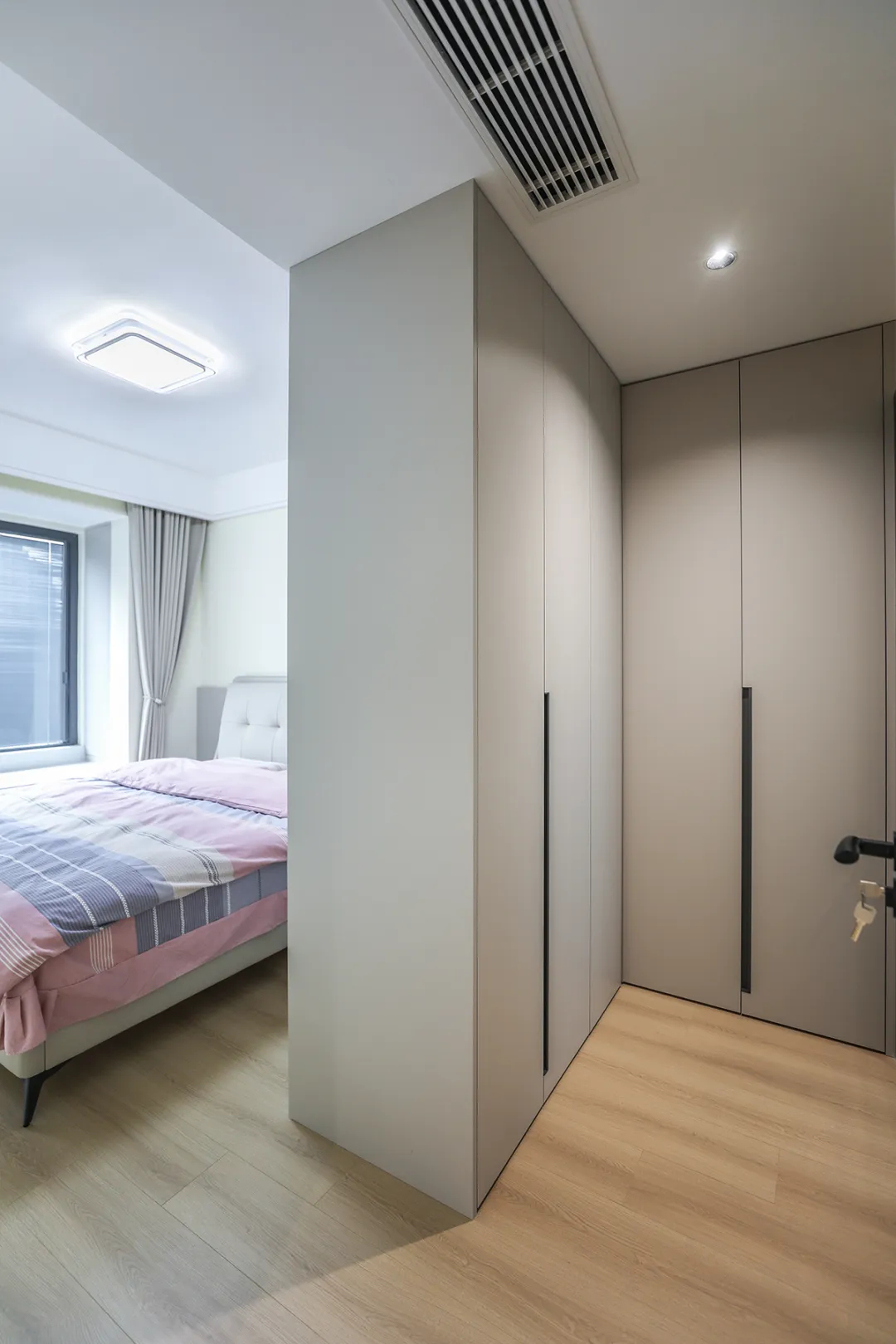 沒有獨(dú)立衣帽間,也別愁。臥室要是夠大,做轉(zhuǎn)角衣柜,里面可以按照長短衣物、配飾來分區(qū),收納量完全不輸衣帽間。