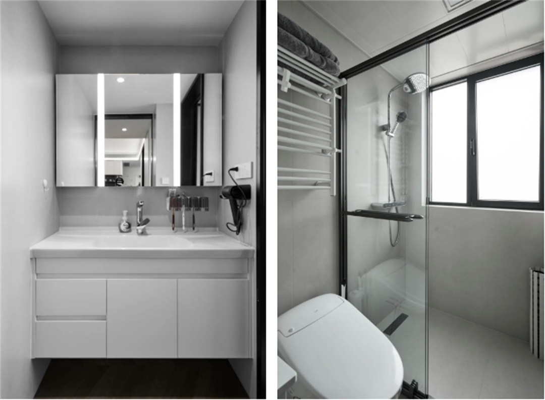 衛(wèi)生間用柔光磚,墻面可以選琺瑯板,好看又好清潔。浴池柜高度要合適,鏡柜底部裝燈,讓衛(wèi)生間更整潔舒適。
