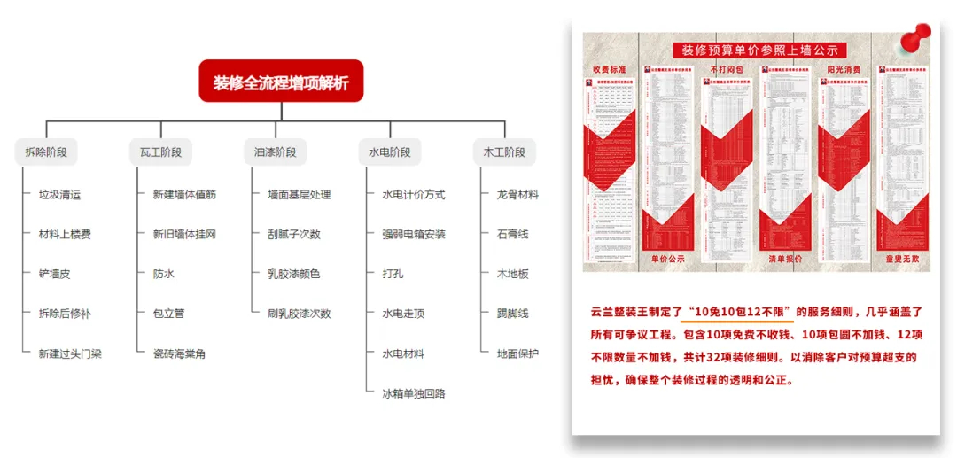 針對消費者擔心的預算超支問題,云蘭整裝王提供了清單式報價服務,確保每一項費用都清晰明了,承諾“一口價真全包,開工后不加錢”,保障給到的裝修報價就是完工后的總花費。