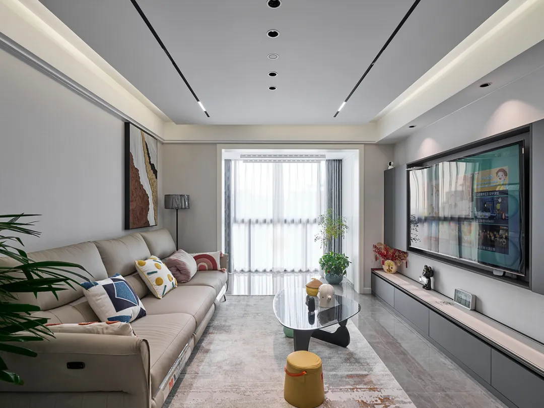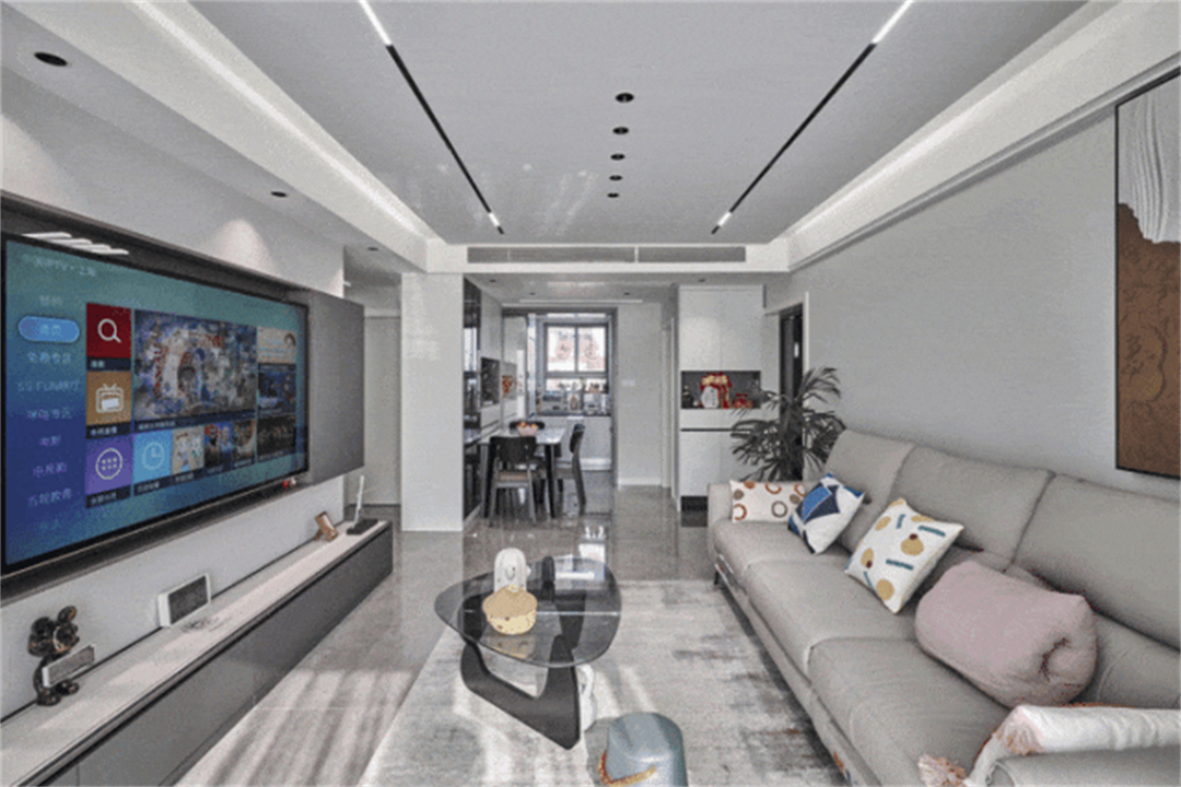 客廳以灰白色調(diào)為主?;疑罄硎卮u和黑色茶幾,再配上白色沙發(fā),明暗交錯(cuò),讓整個(gè)空間顯得深邃而神秘。吊頂簡(jiǎn)約設(shè)計(jì),僅在邊角處輔以邊框增加層次感,搭配無(wú)主燈設(shè)計(jì)和幾何造型的燈具,讓客廳整體風(fēng)格簡(jiǎn)約而不失高級(jí)感。