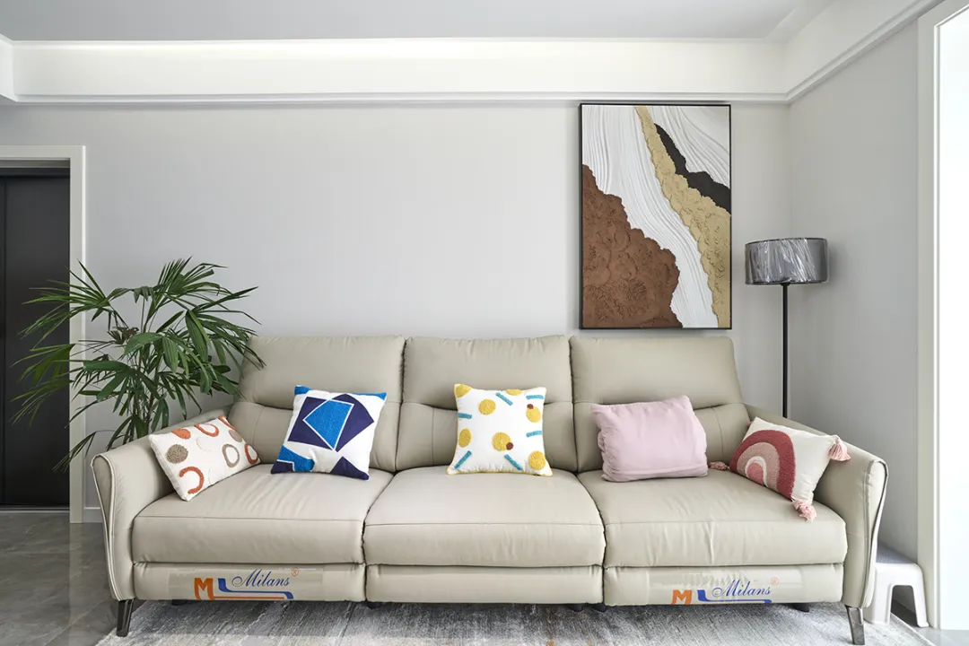 米色沙發(fā)搭配多色抱枕,既能成為視覺焦點(diǎn),又能提供了一個(gè)放松身心的空間。墻上的抽象裝飾畫以大地色系為主,與沙發(fā)顏色相呼應(yīng),增添了藝術(shù)氣息,提升了空間的品位。