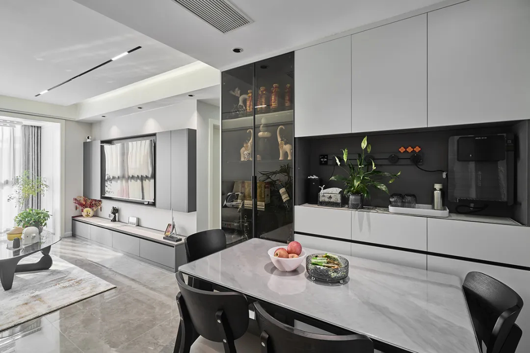3、餐廳依墻設(shè)計(jì)了黑白配餐邊柜,搭配大理石餐桌與黑色椅子,營(yíng)造出溫馨的用餐氛圍;
