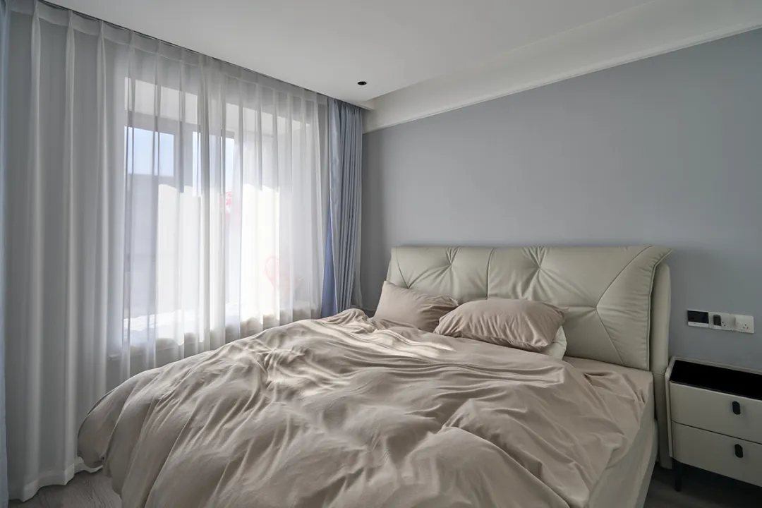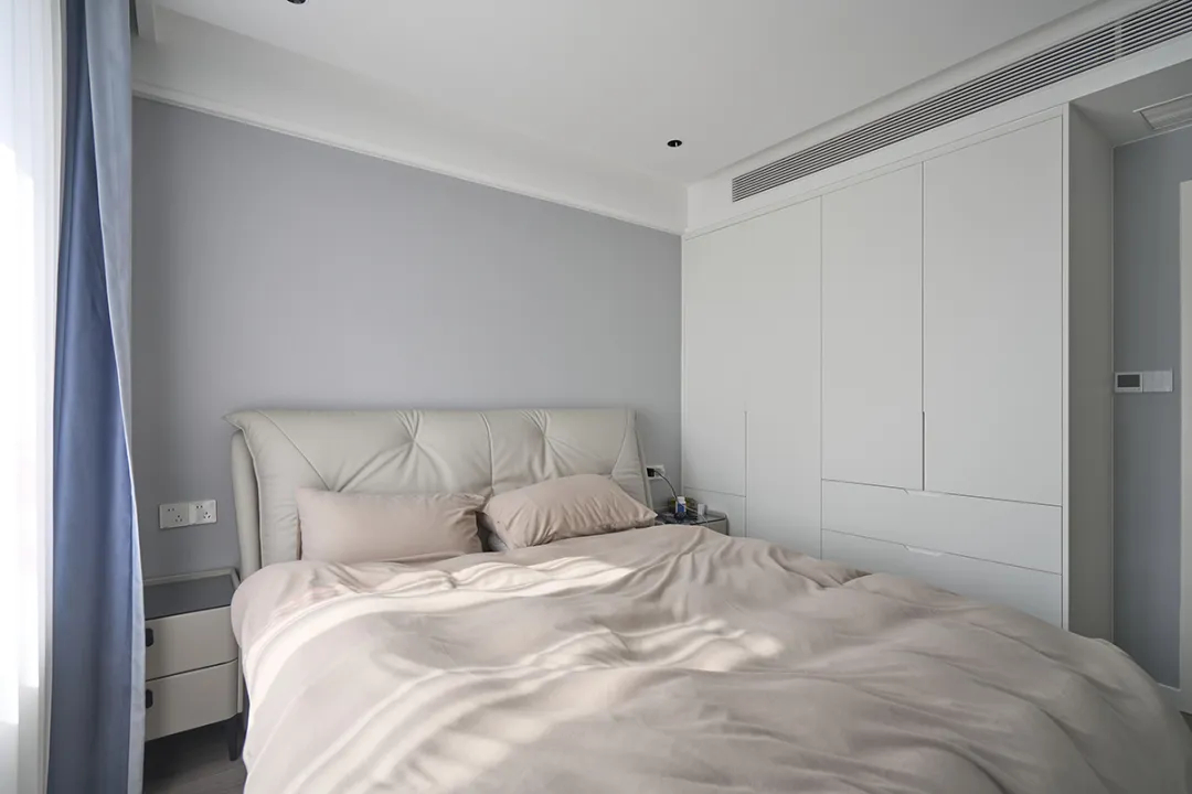 主臥的設(shè)計(jì)注重營(yíng)造一個(gè)寧?kù)o舒適的休息環(huán)境。墻面采用了柔和的淺灰色,與米色床頭板和同色系的床上用品形成了和諧的色彩搭配,讓整個(gè)空間顯得溫馨而放松。