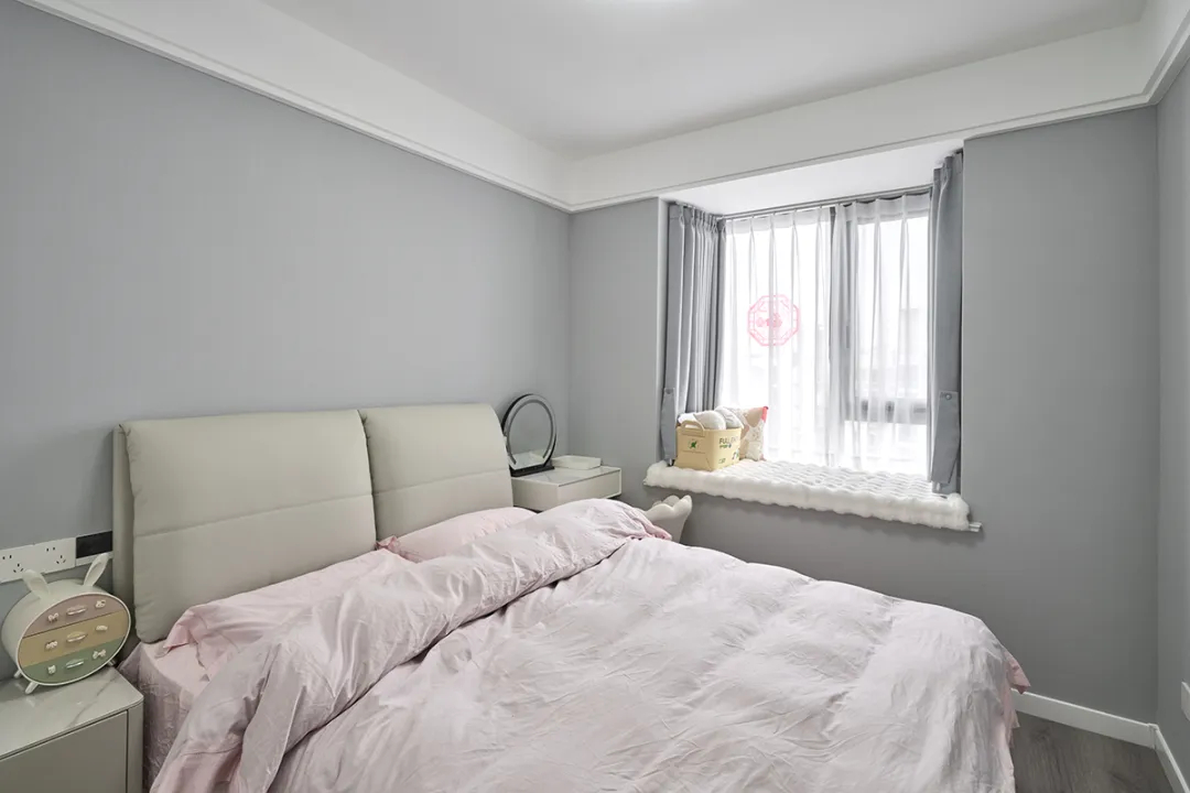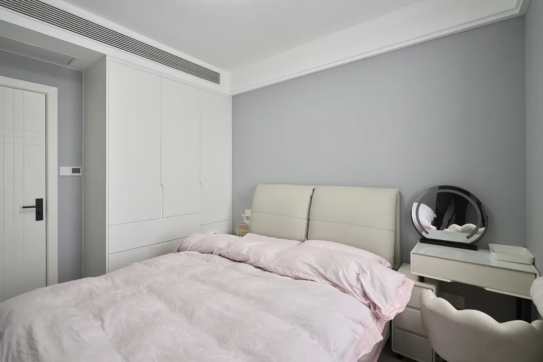 次臥墻面同樣采用了淺灰色,搭配粉色的床品,為房間增添了一抹柔和的色彩。窗戶旁邊的小化妝臺(tái)和圓鏡,不僅實(shí)用,還讓次臥顯得更加精致。