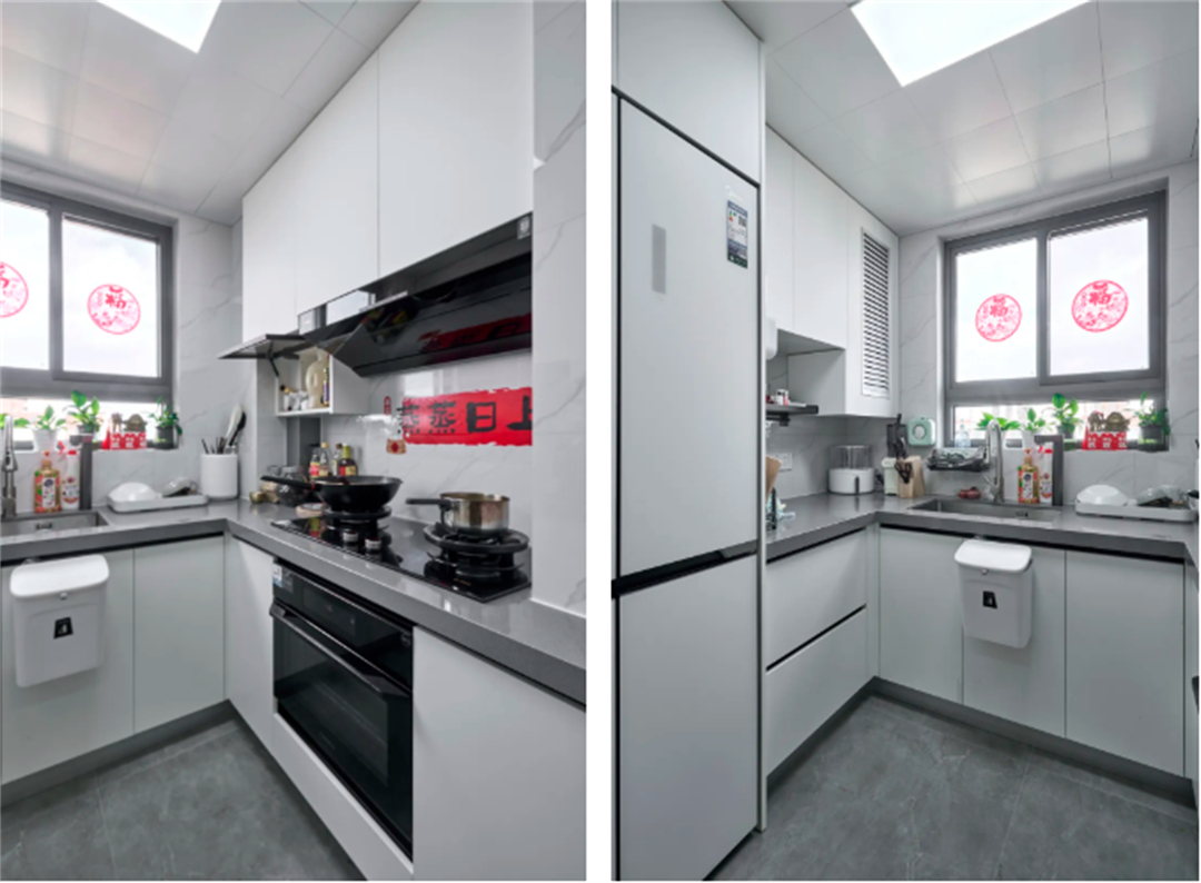 廚房的設(shè)計(jì)以實(shí)用為主,白色櫥柜與灰色大理石臺(tái)面的結(jié)合,讓整個(gè)廚房顯得干凈整潔?,F(xiàn)代化的廚房電器和充足的儲(chǔ)物空間,讓烹飪變得更加得心應(yīng)手。此外,廚房的布局也考慮到了操作的便利性,讓每一次下廚都成為一種享受。