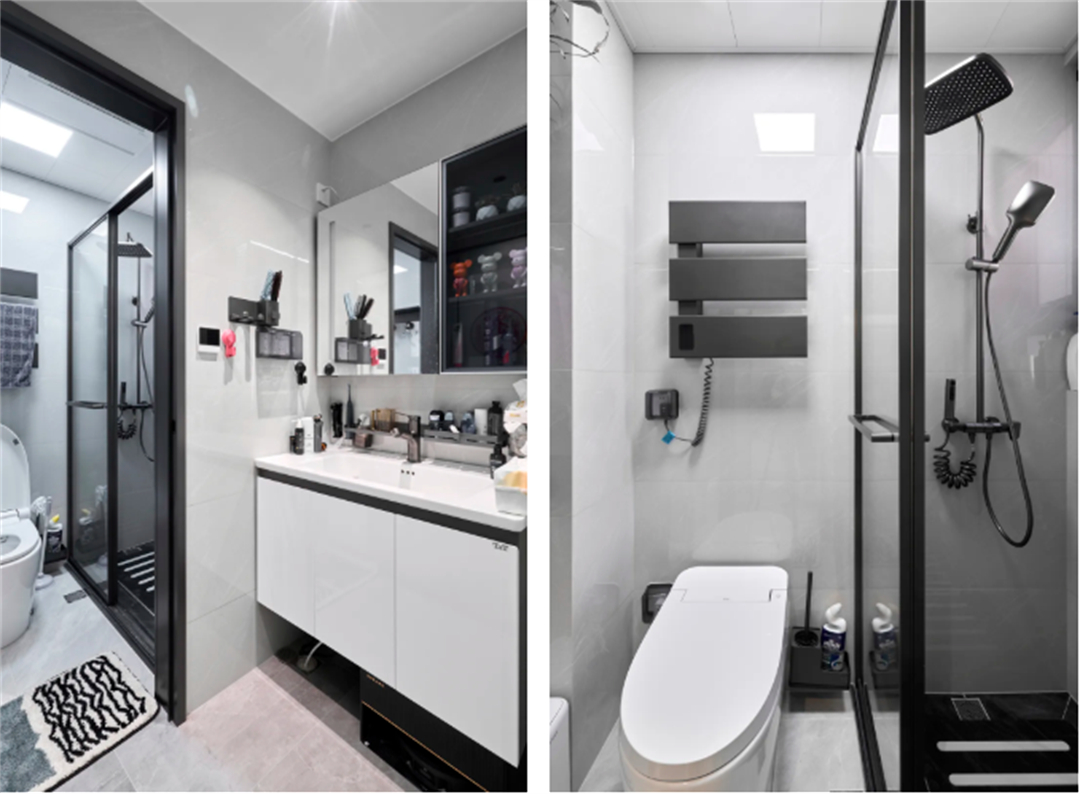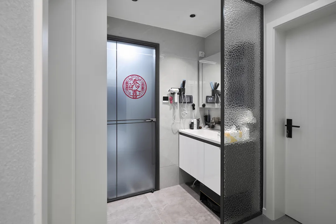 衛(wèi)生間采用水波紋玻璃隔斷,巧妙實(shí)現(xiàn)了干濕分離,既增加了隱私性,又減少了清潔工作量。現(xiàn)代化的衛(wèi)浴設(shè)施和充足的儲(chǔ)物空間,讓日常的個(gè)人護(hù)理變得更加舒適和方便。