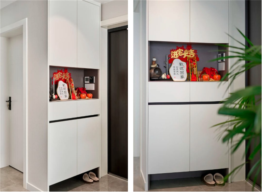 玄關(guān)的白色鞋柜設(shè)計(jì),既滿足了收納需求,同時(shí)與整體風(fēng)格保持一致。鞋柜下方的開放式空間用于放置日常穿著的鞋子,方便進(jìn)出時(shí)更換。