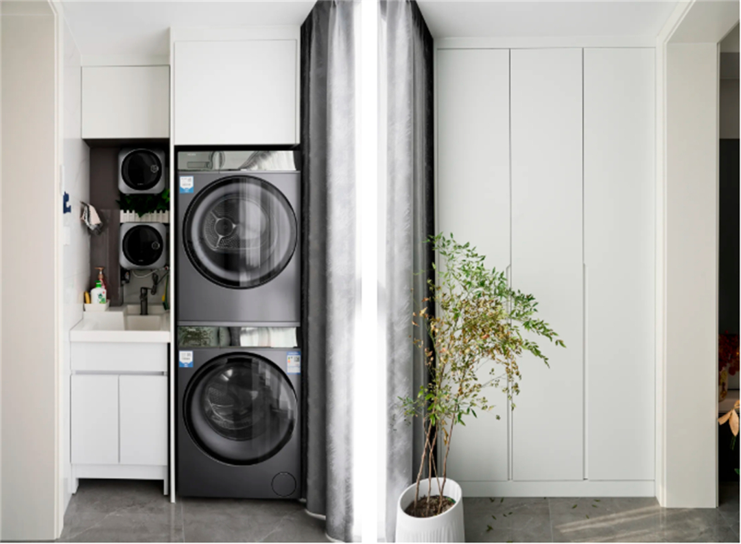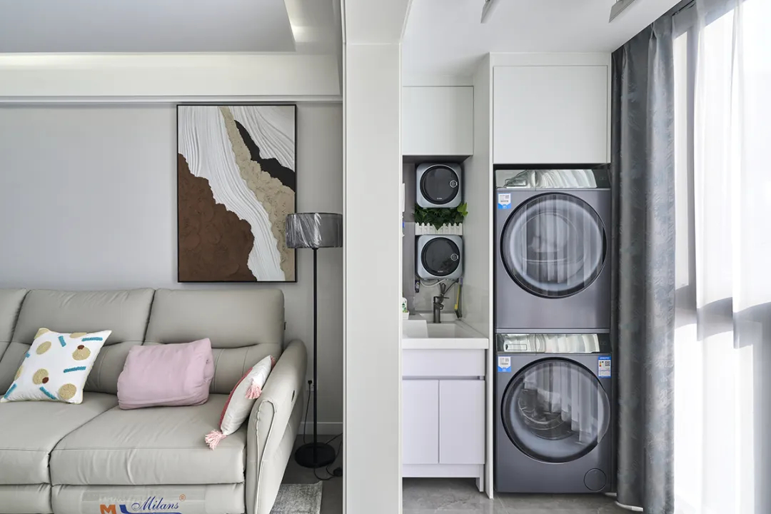 陽(yáng)臺(tái)的設(shè)計(jì)充分利用了自然光線,將其打造成了一個(gè)多功能的空間。洗衣機(jī)和烘干機(jī)的擺放,讓陽(yáng)臺(tái)成為了洗衣和晾曬的理想場(chǎng)所。同時(shí),綠植的點(diǎn)綴也為陽(yáng)臺(tái)增添了一份生機(jī),讓這個(gè)小空間變得更加宜人。