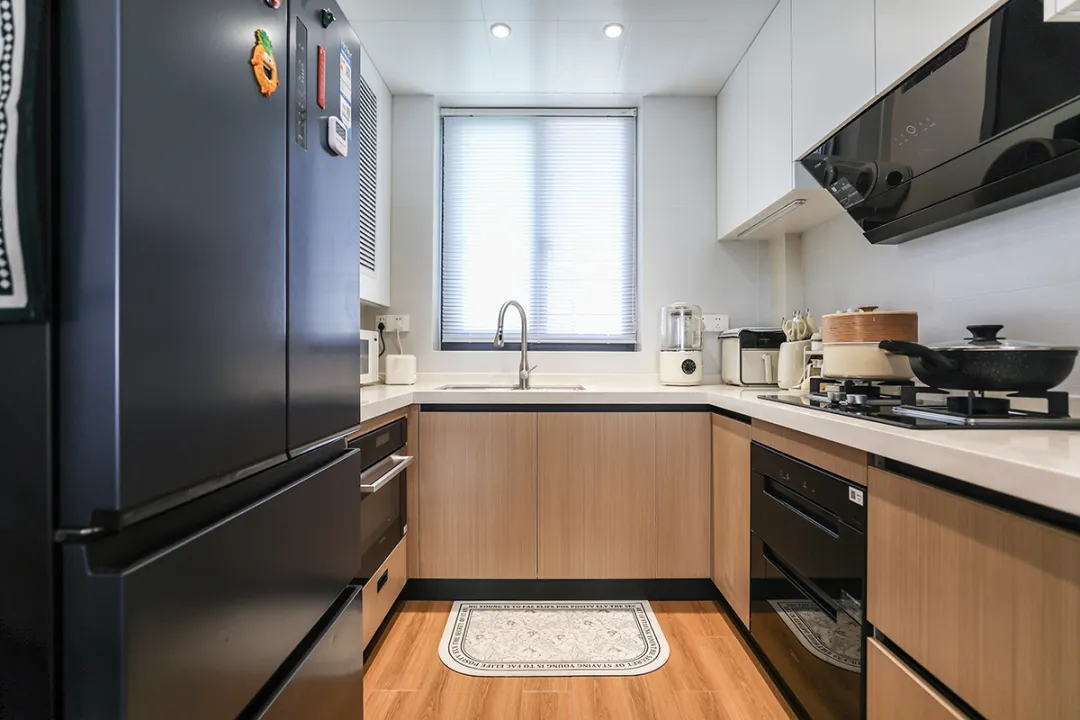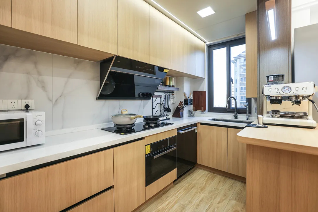 該廚房采用U型布局,提升了空間使用效率。木質櫥柜與白色臺面搭配,營造出溫馨自然的氛圍。大型雙開門冰箱和齊全的烹飪設備,如燃氣灶、抽油煙機、咖啡機等,滿足了日常烹飪需求。