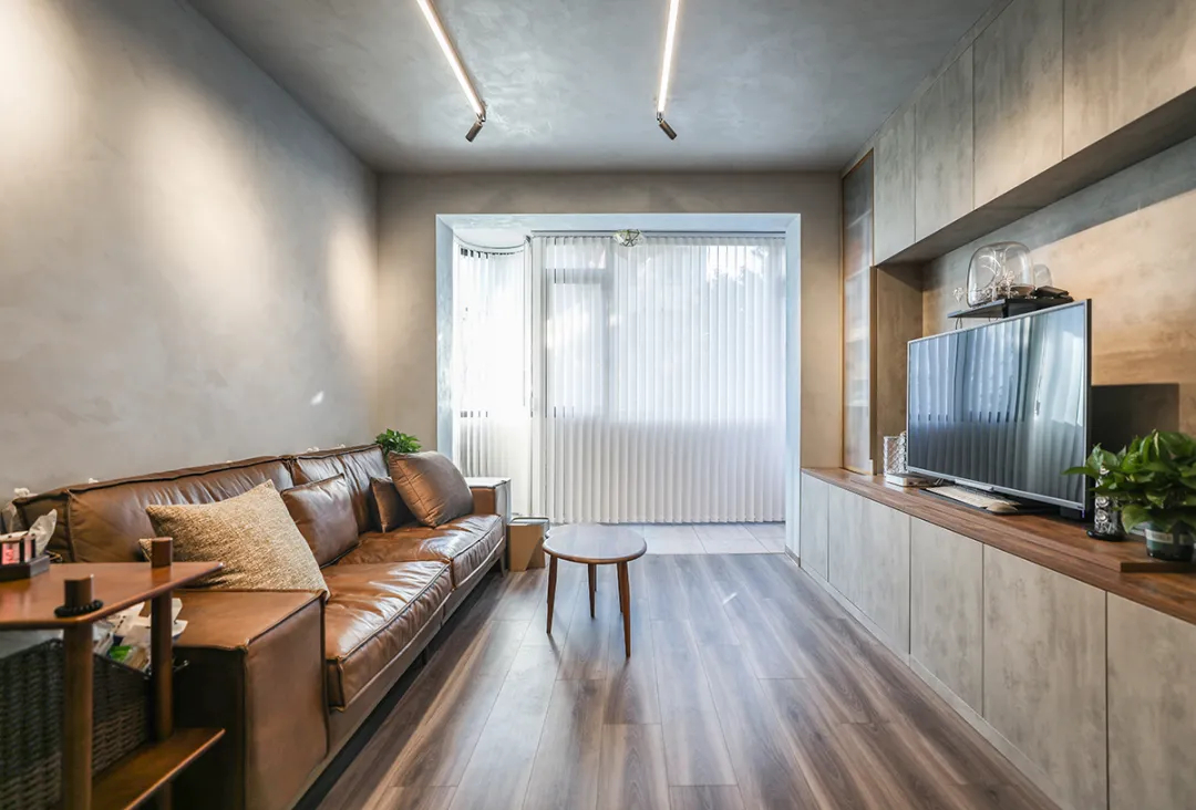 ①墻面保留批蕩層 鏟掉膩子露水泥肌理,刷透明防水罩面。搭配2cm黑色極窄踢腳線,比藝術漆省1.5萬/棟,還自帶工業濾鏡。