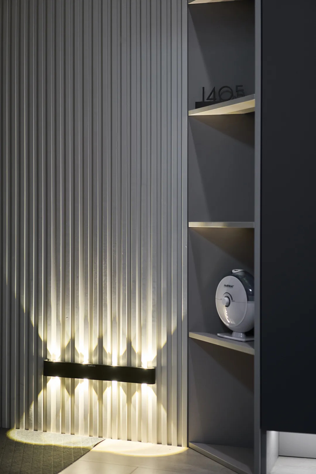 過道里的凹陷區,做個柜子填平是常規操作。但你敢不敢在柜門上動點心思?加個擋板、加幾條擋條,一扇普通的柜門,順手就變成了雜志架。成本幾乎沒有,但過道從此不單調了。