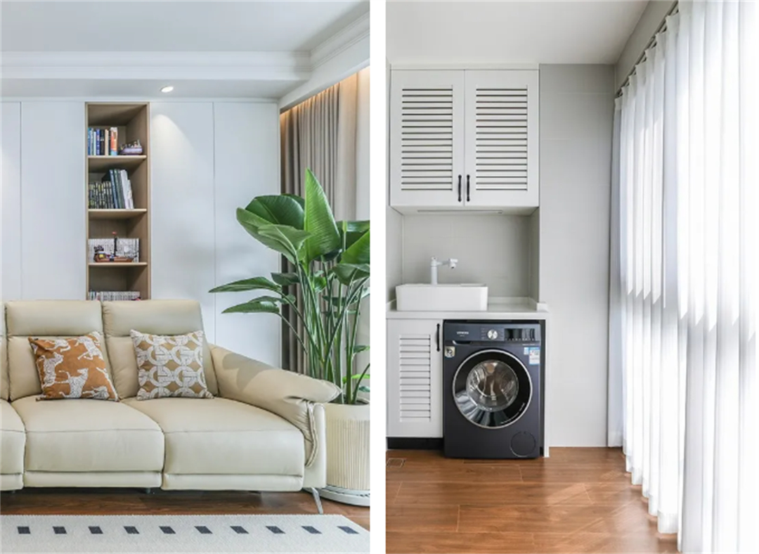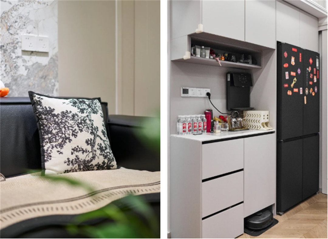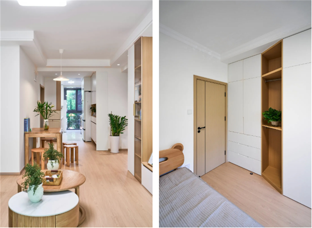 設計師采用北歐原木風格進行設計,全屋智能一體化居家更便捷;裝修建材和家具都選了耐用環保材料,夫妻倆住得安心、放心。