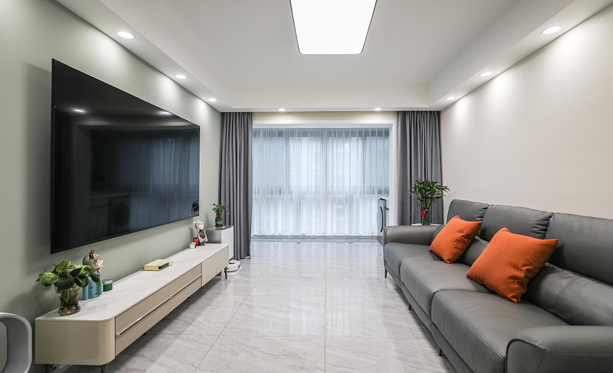 客廳是整個房子的核心區域不要太多裝飾柜,空間大氣,運用回字吊頂+筒燈+主燈,營造出現代化空間,又與餐廳相互呼應