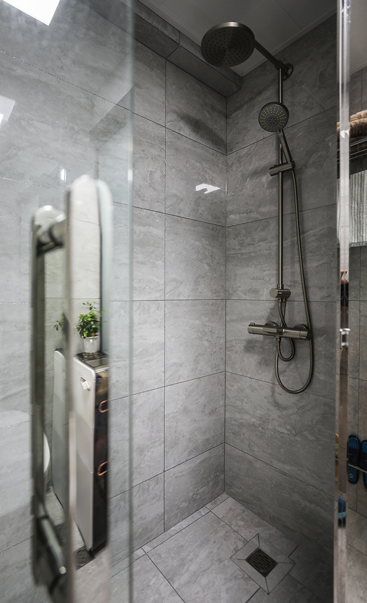 衛生間干區也是比較搶眼的地方,黑色鈦合金的門套凸顯高級感,半墻的設計,不僅顯得空間大,還可以放裝飾物,實用