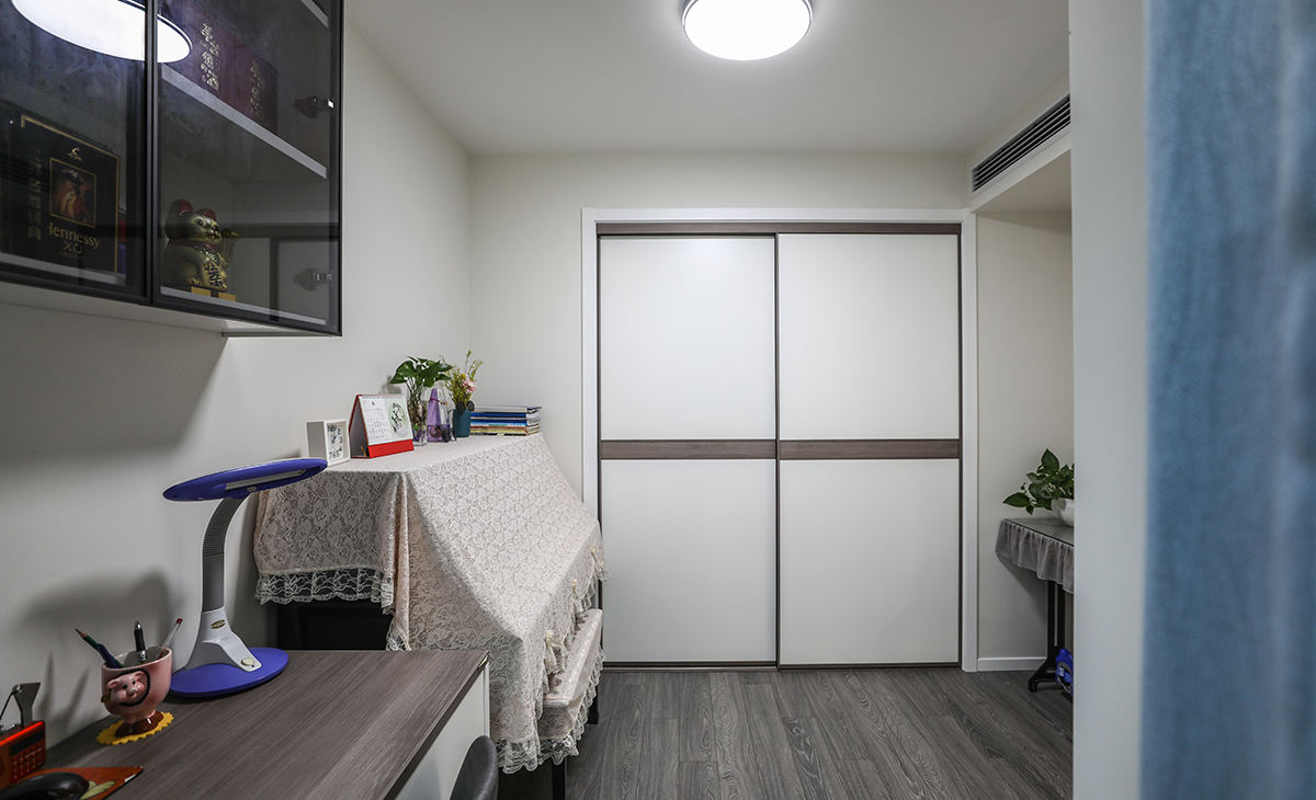 入戶的玄關柜采取換鞋凳+鞋柜的設計,老夫妻畢竟年紀有點大了,有了換鞋登更加方便生活,鏤空的區域放鞋,放鑰匙都很方便。