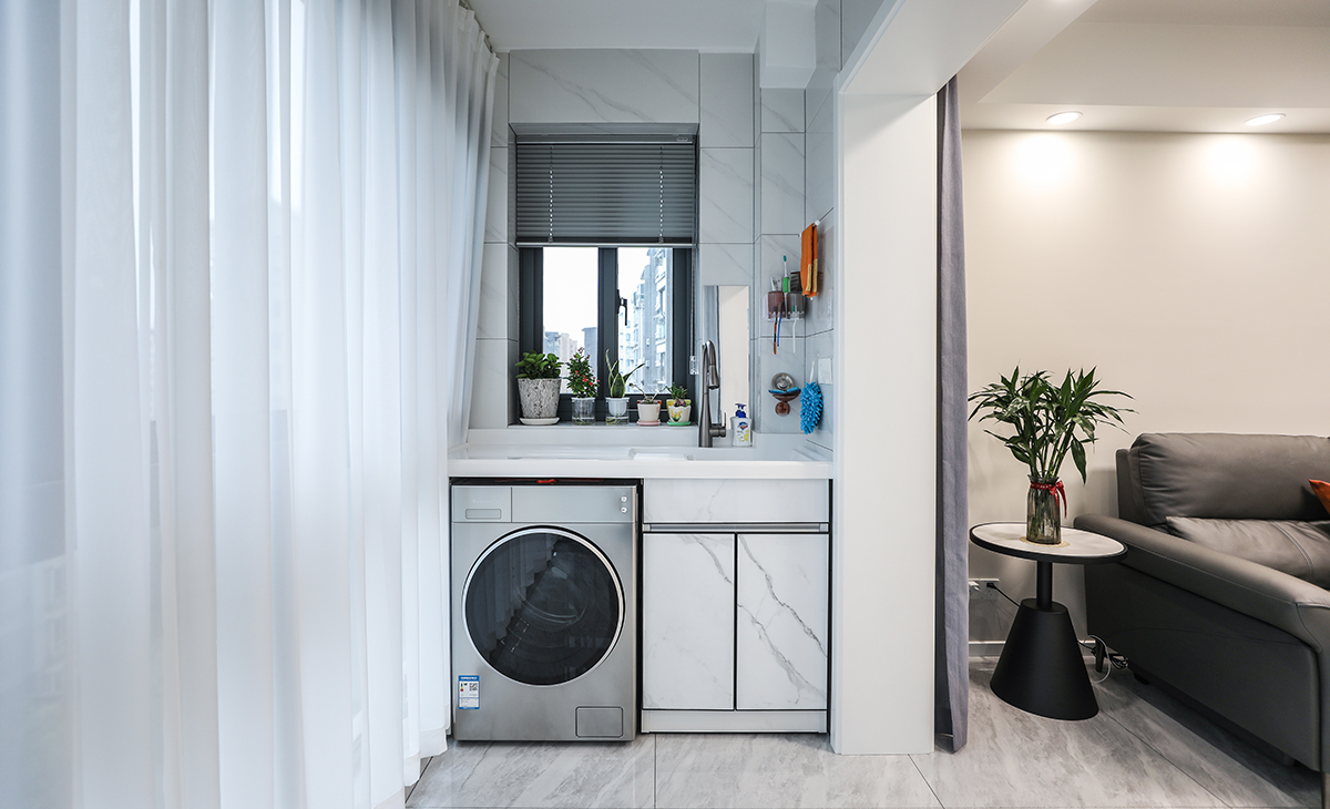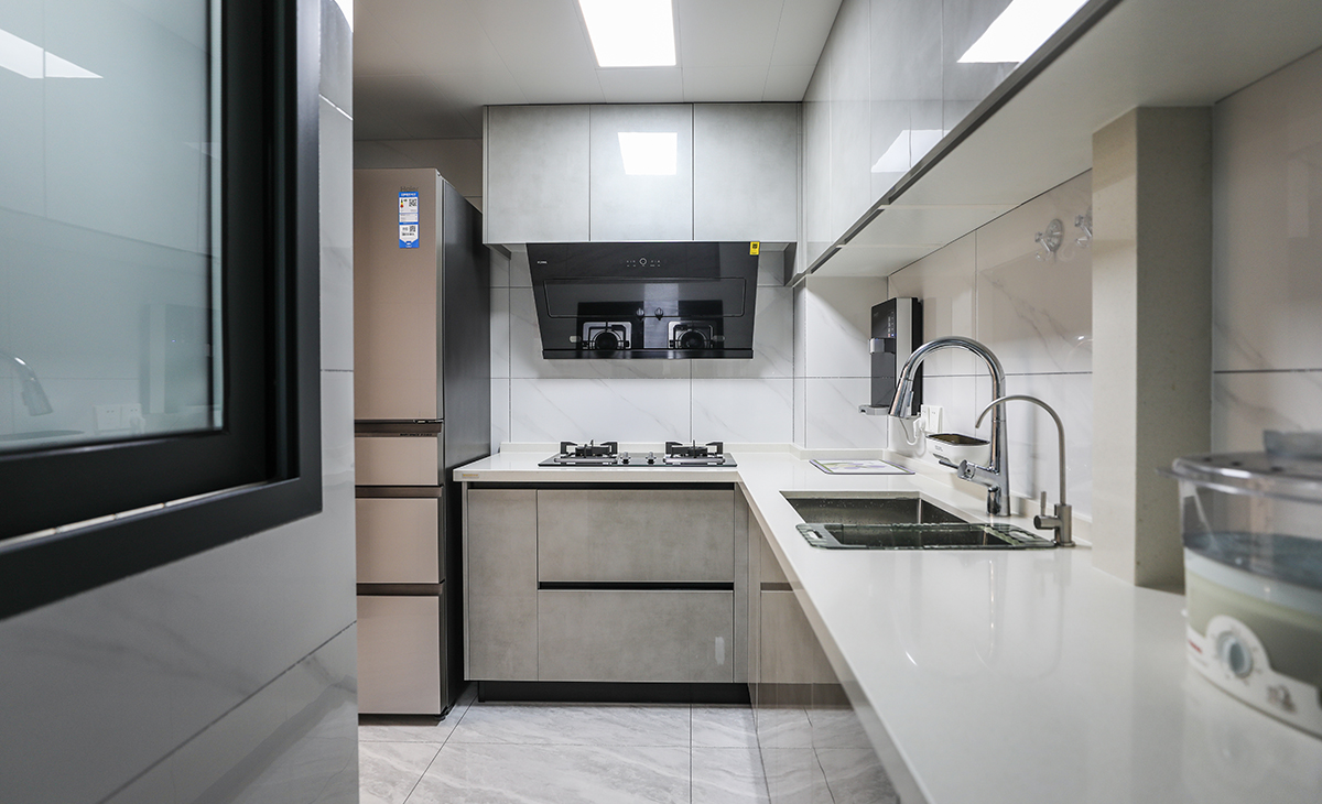 廚房是老爺子最喜歡的區域了,臺面采用巖板,干凈,大氣,吊頂是大板蜂窩板,L的料理臺也方便制作各種美食