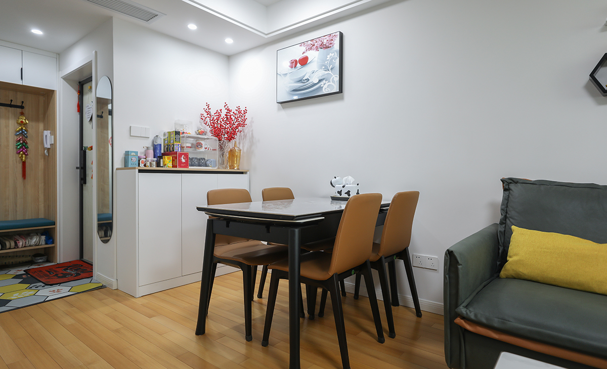 該居室主人夫妻倆都是做生意成功人士,兒子正在上高中,父母在同小區(qū)另一套房子里,居住一家三口,所以該套房子裝修體現(xiàn)簡潔、干凈,體現(xiàn)簡約風(fēng)格的舒適之美。講究功能第一,花里胡哨的裝飾物可以拋開不要。該套是二室二廳一衛(wèi),主臥主人住,兒子住1間。整體墻面做乳膠漆調(diào)色珍珠白,電視背景墻放80寸電視,享受家庭影院般的體驗(yàn),餐桌邊放餐邊柜,增加收納空間,沙發(fā)背景用層板分割,都體現(xiàn)了現(xiàn)代簡約風(fēng)格的大氣時(shí)尚,營造了一種大氣清爽、簡約而不簡單的氛圍,凸現(xiàn)了主人干凈清爽的性格。
