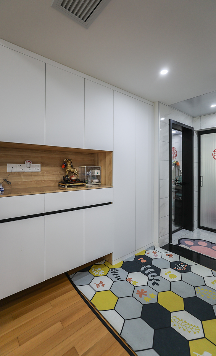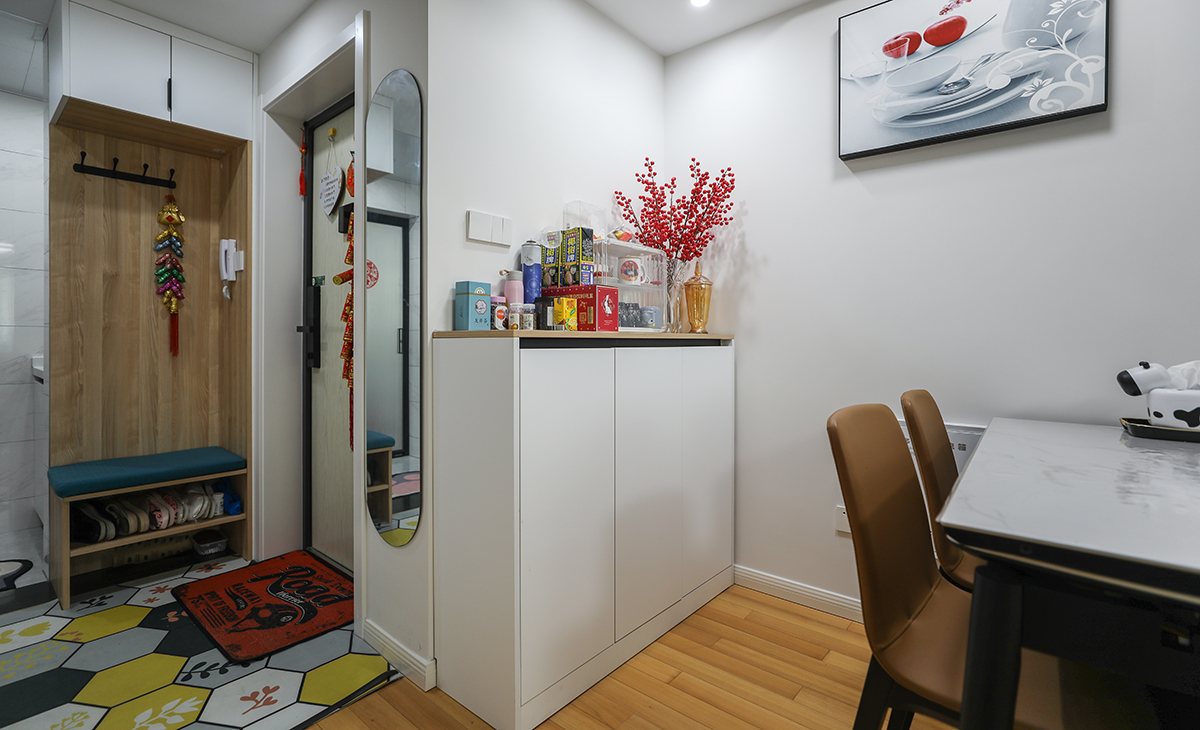 中間和下方漏空的鞋柜,隨手可以放置包包,鑰匙等,既實(shí)用,又有裝飾性,旁邊搭配一個(gè)零食飲料專用冷藏冰箱,就更加體現(xiàn)了居家的舒適性。