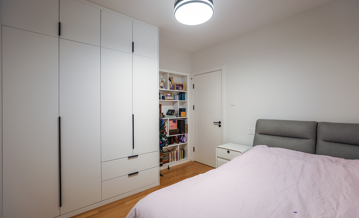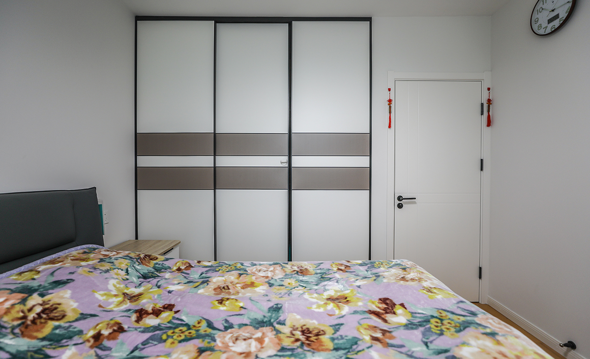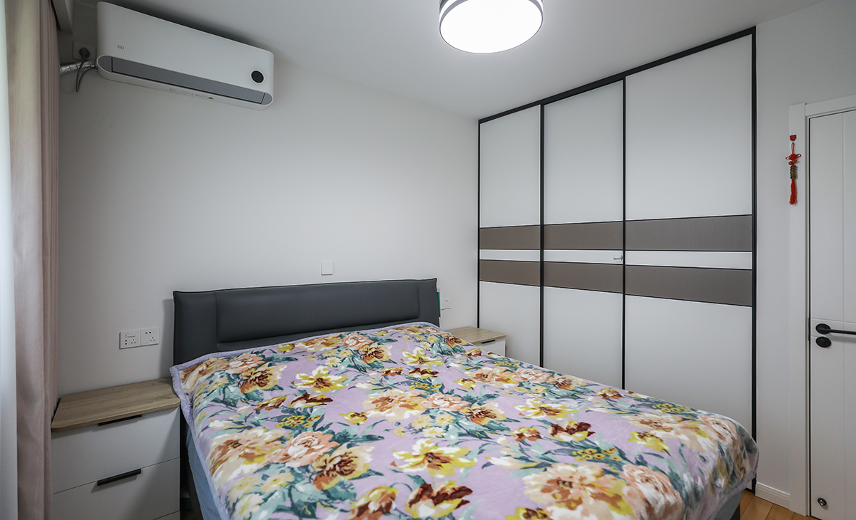 主臥做了衣帽間,增加儲藏,既美觀又實(shí)用,顏色上深淺搭配地錯落有致,橡木色地板,墻面暖白色干凈清爽,頂面白色乳膠漆,輕巧時(shí)尚的吸頂燈,空間很溫馨和諧。