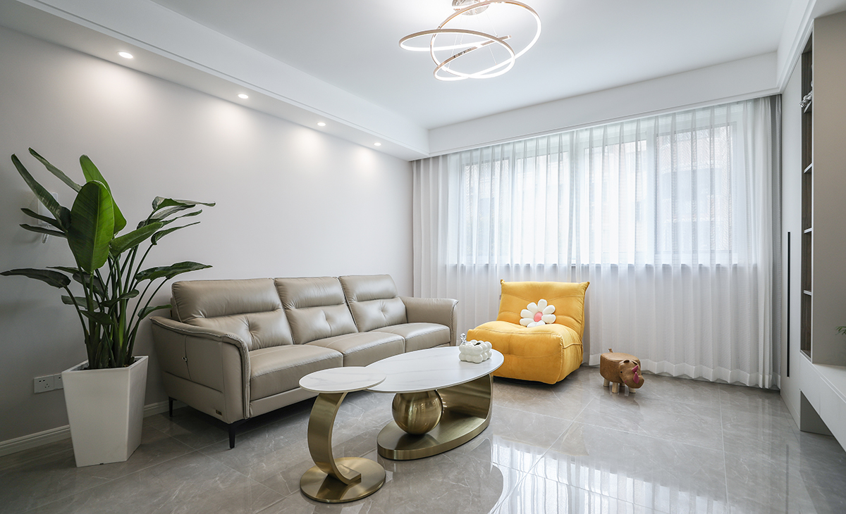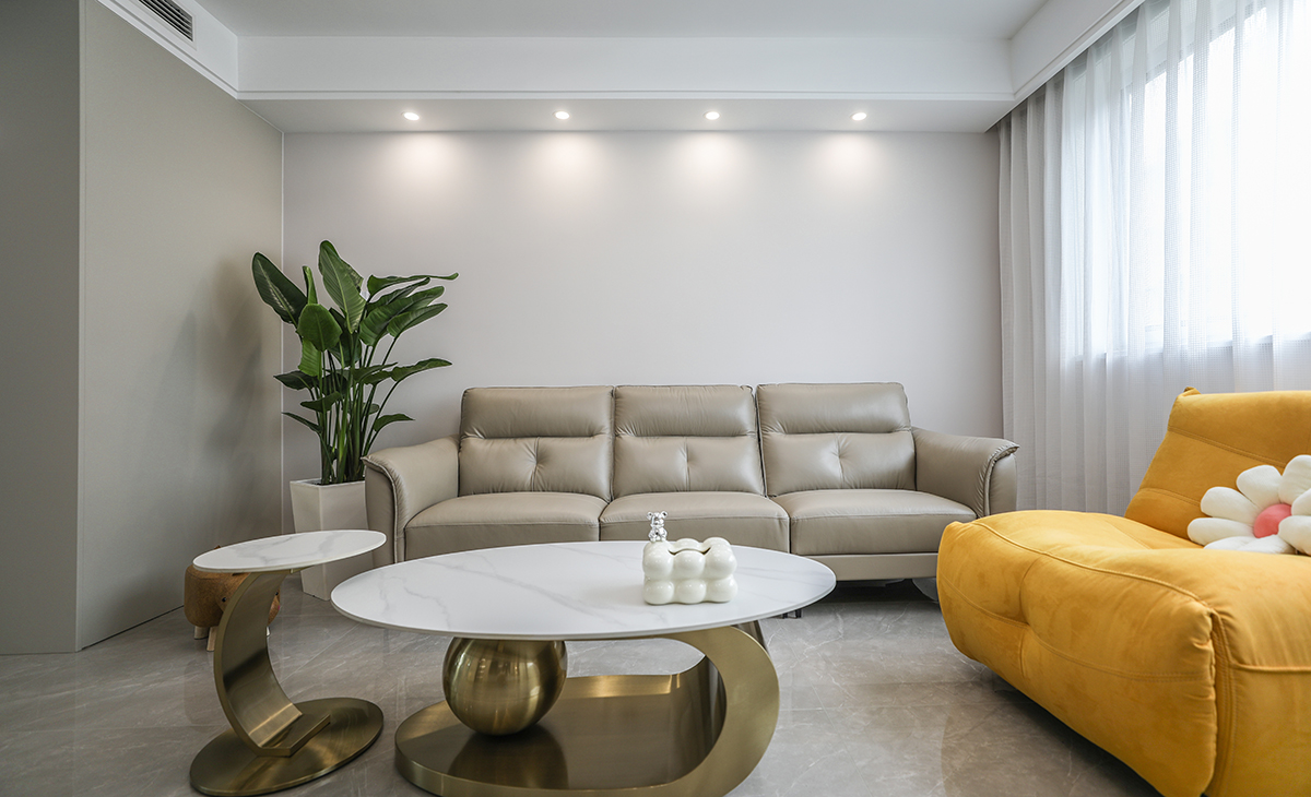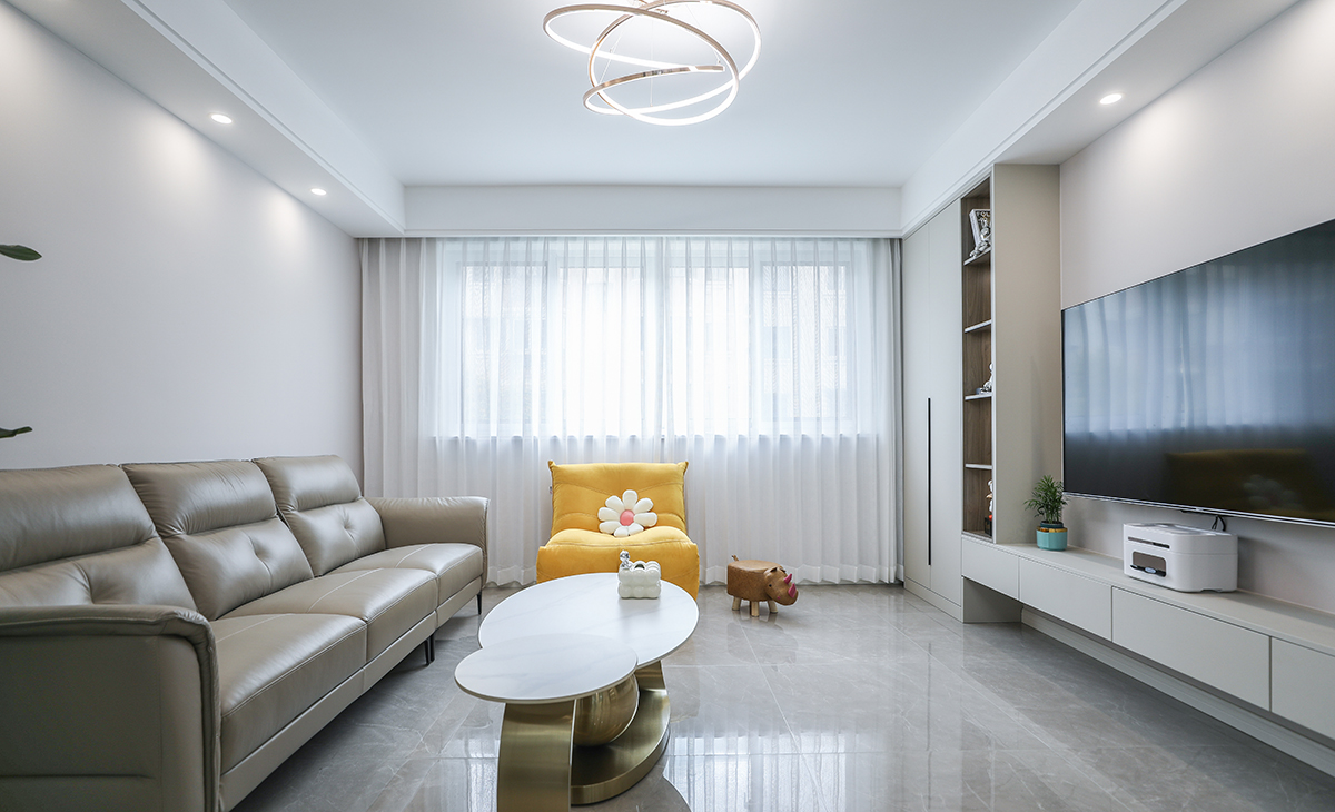 客廳整體風格采用簡約風格,是當下比較流行的處理方式,在顏色方面有些對比 ,淺色調為基準  部分深色玻璃裝飾柜進行點綴,協調整體空間。