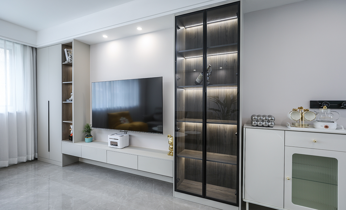 客廳整體風格采用簡約風格,是當下比較流行的處理方式,在顏色方面有些對比 ,淺色調為基準 部分深色玻璃裝飾柜進行點綴,協調整體空間。