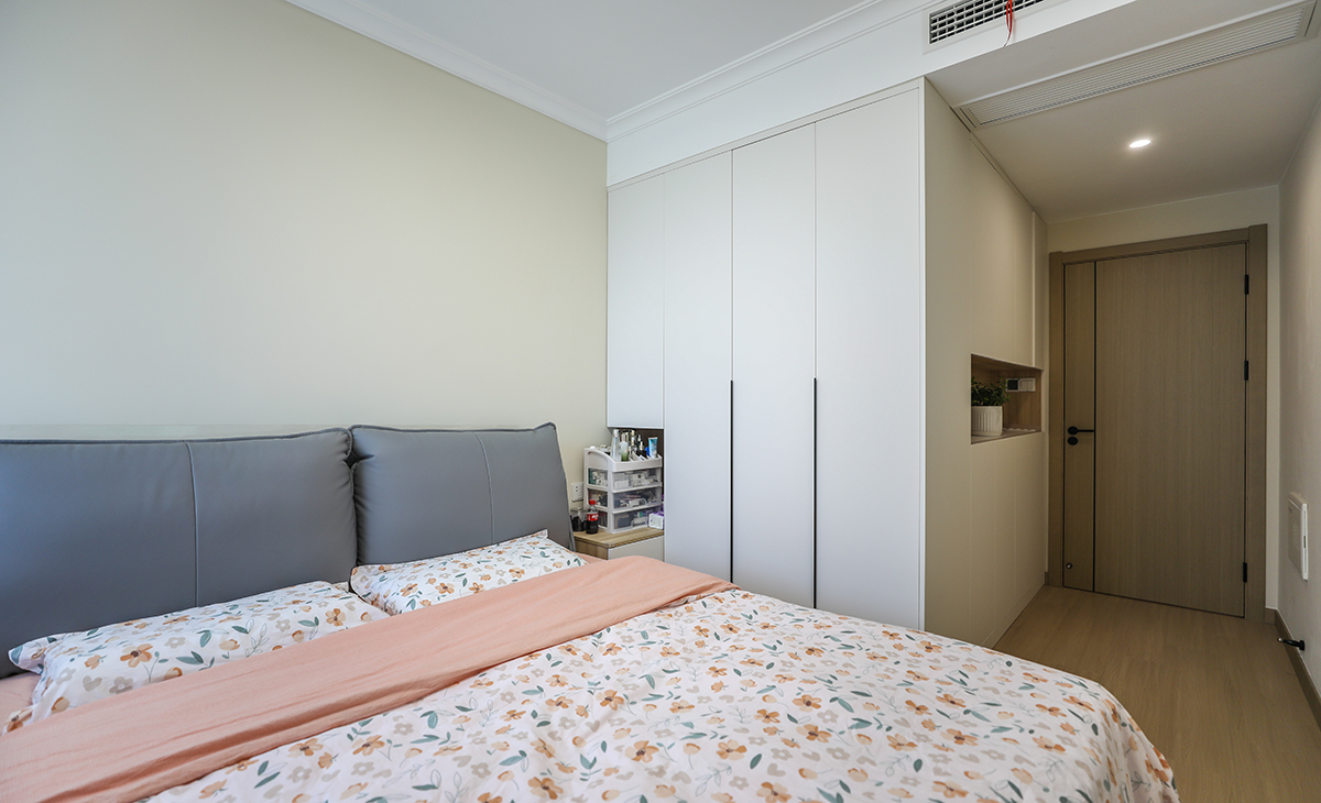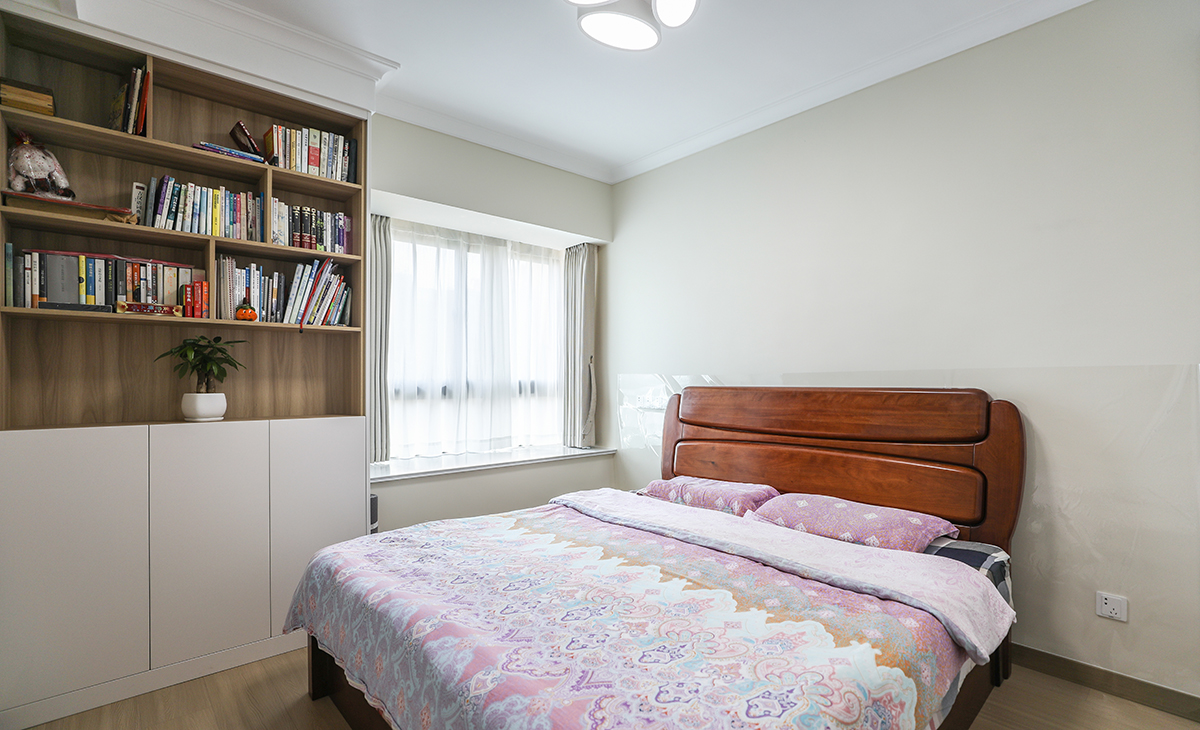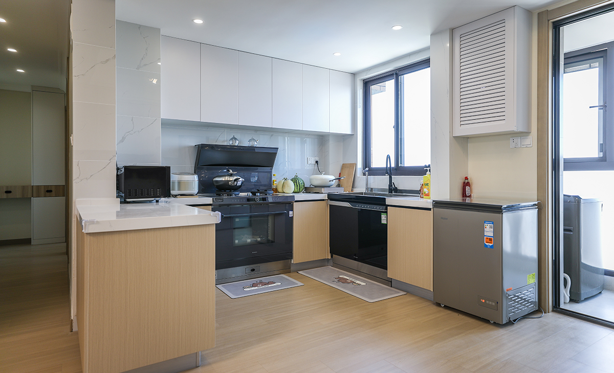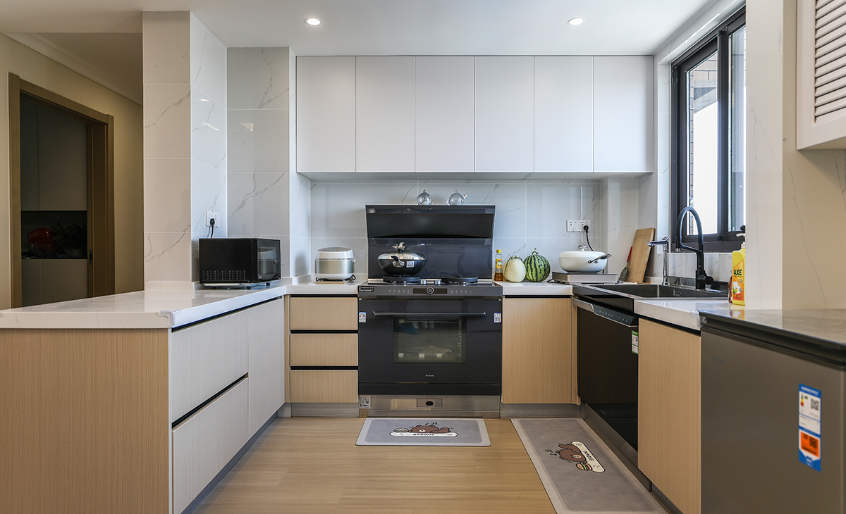 業主喜歡溫馨簡潔的色調,要結合中自己原有的家具,整體色彩寬敞明亮,這里做開放式廚房,通過改造兩個朝南臥室之間的單磚墻體,儲物空間提高一倍