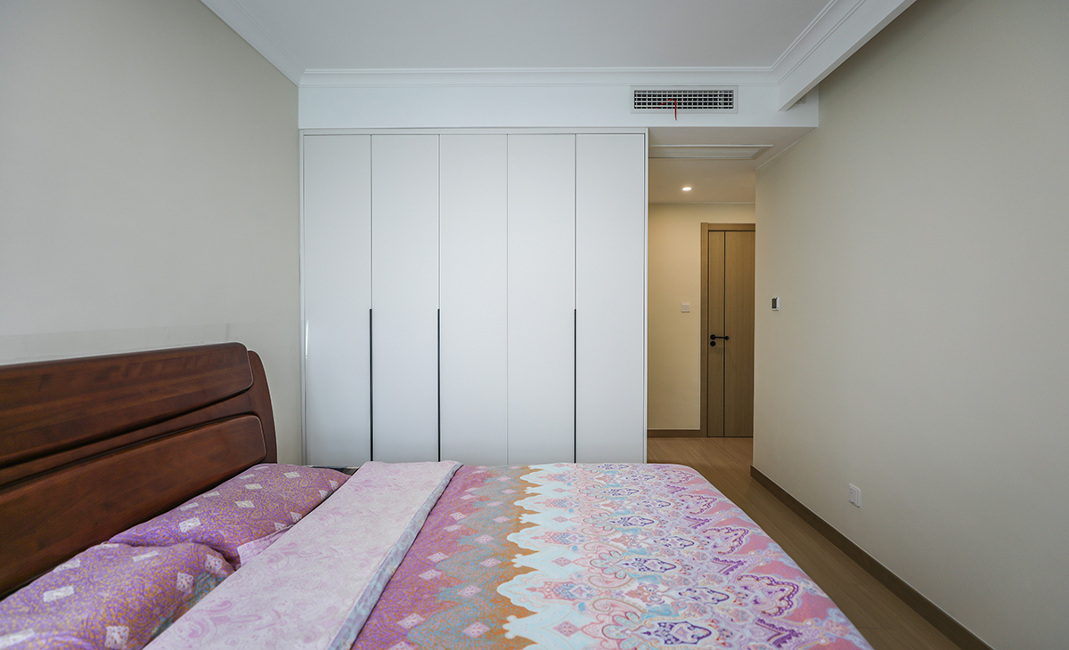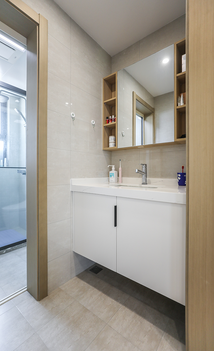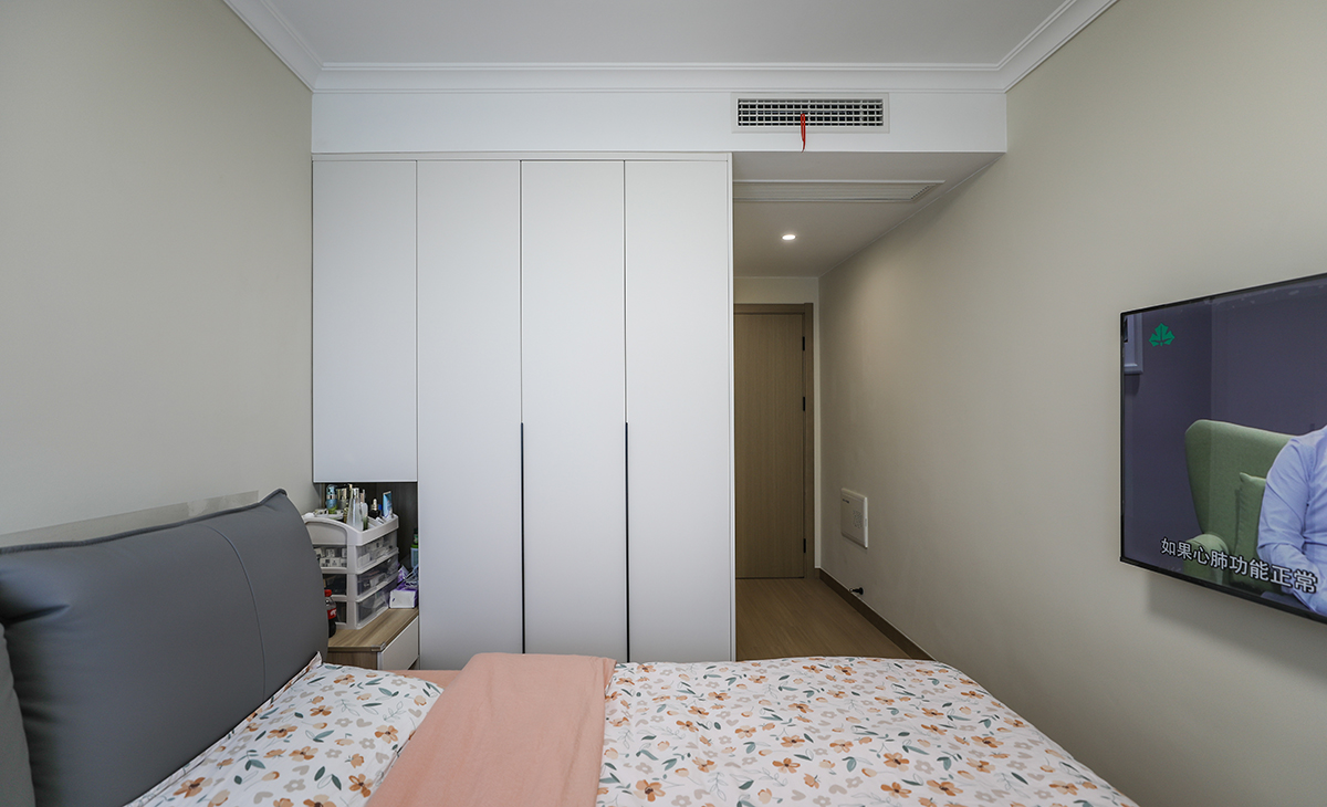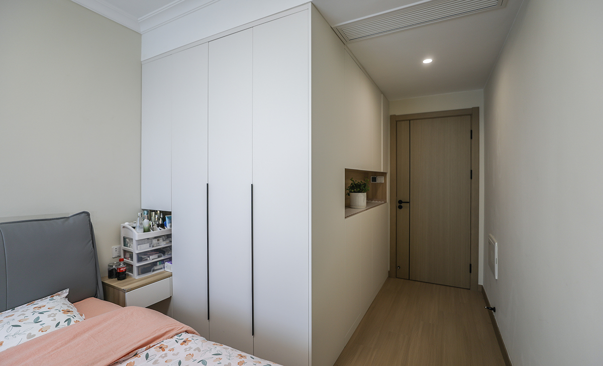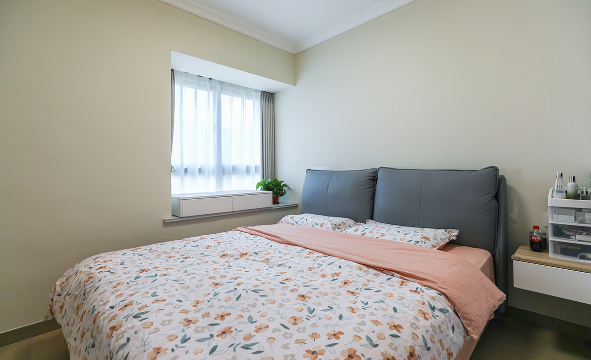 業主喜歡溫馨簡潔的色調,要結合中自己原有的家具,整體色彩寬敞明亮,這里做開放式廚房,通過改造兩個朝南臥室之間的單磚墻體,儲物空間提高一倍