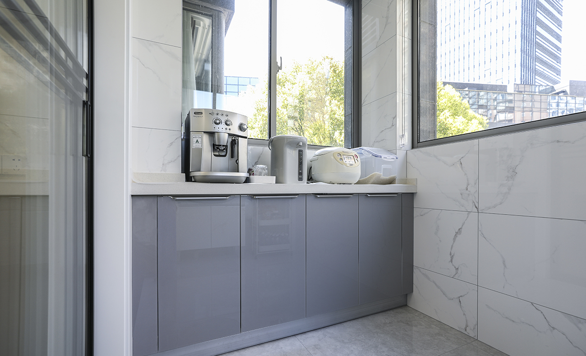 開放式的陽臺,更加需要一個美觀精致的洗衣機搭配,另外一邊做個收納柜,整體也是很美觀簡潔的!