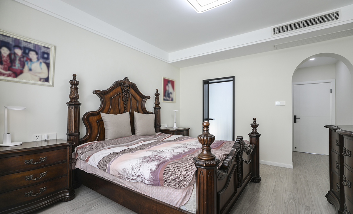主臥過道埡口做半弧形、拱門的造型裝飾,用掛圓處理去柔和線條,拋去那些多余且繁復(fù)的裝飾,展現(xiàn)了生活的精致感,讓休息空間溫馨優(yōu)雅。