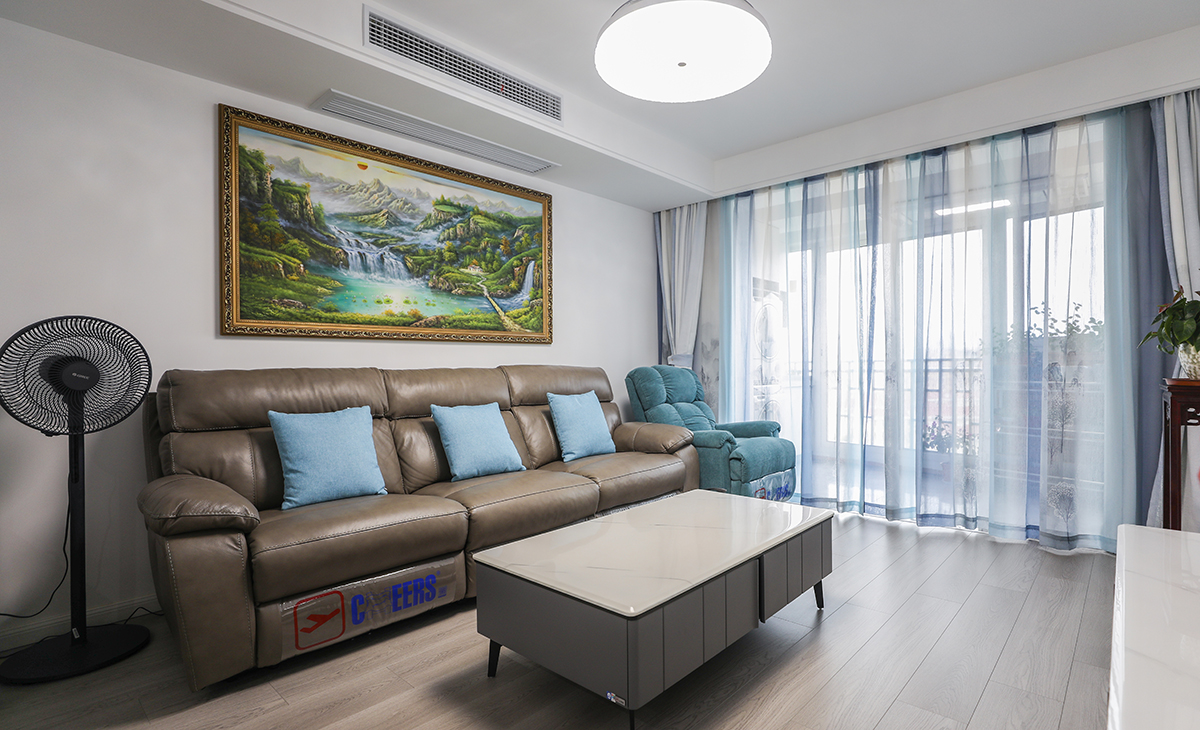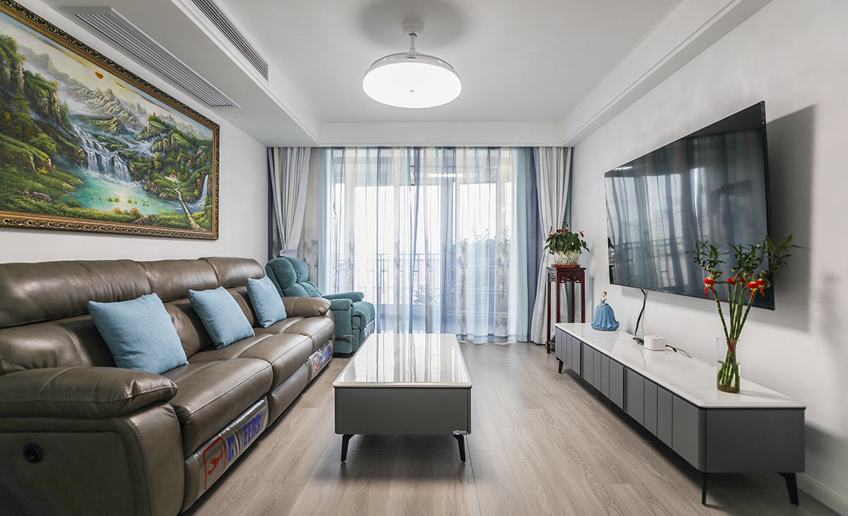 該套居室整體裝修風格是現代風格,背景墻沒有做以大面墻留白,僅用白墻來修飾,沙發采用皮質沙發,體現現代的大氣時尚,有質感,凸現了主人雍容華貴的氣質和非凡不俗的眼光,體現了主人優雅的內涵和高尚的審美情操。
