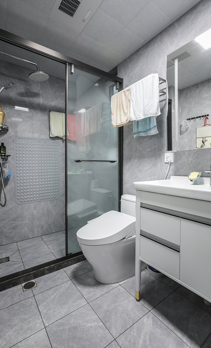 衛生間空間很大,淋浴間與洗漱空間用透明玻璃分隔開來,做到了布局的干濕分離,利于打掃,且視野上更加寬闊