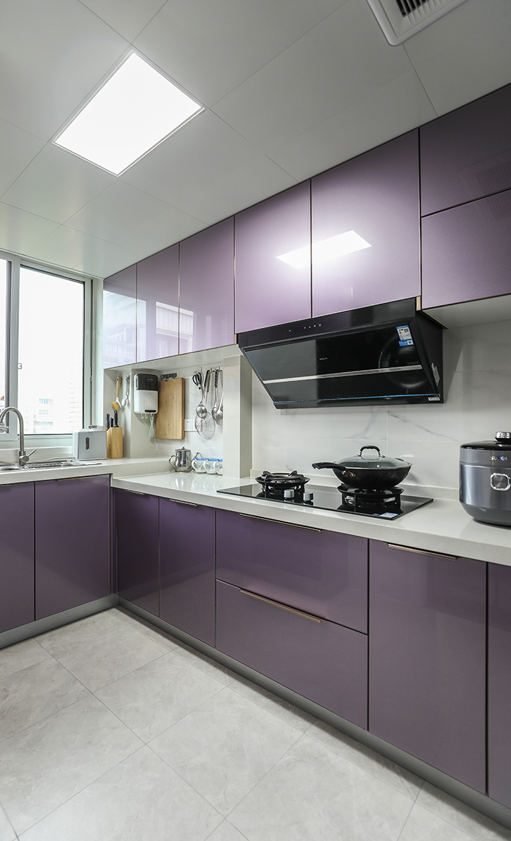 廚房與餐廳相連,讓主人做飯又可以和客人互動,滿足主人對美食文化的追求,色調上以紫色為主,配上黑色電器,高檔有神秘感。