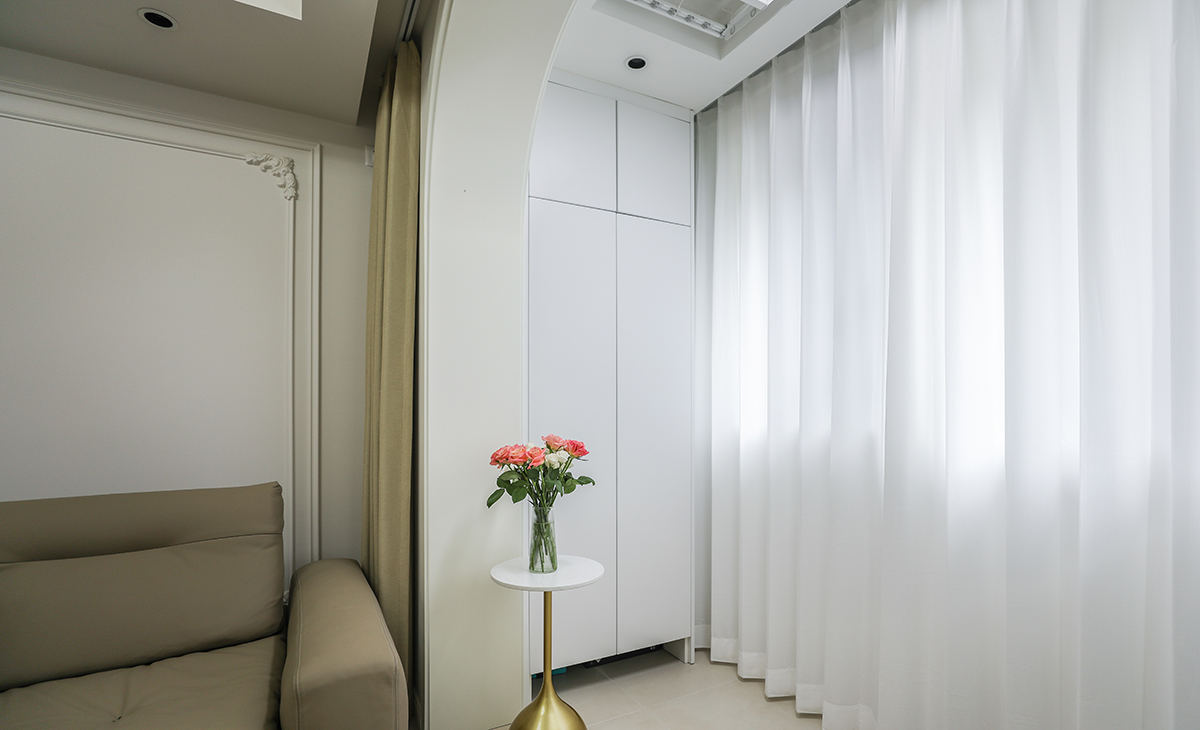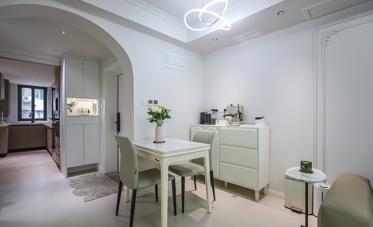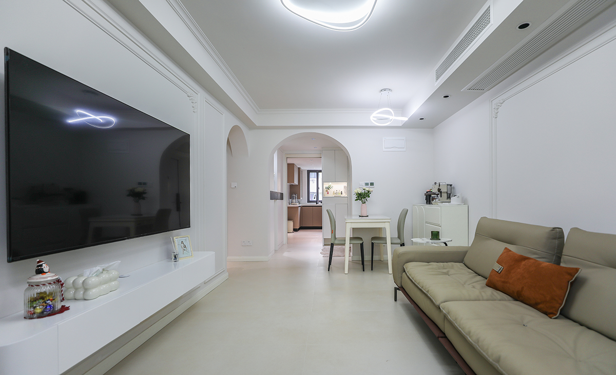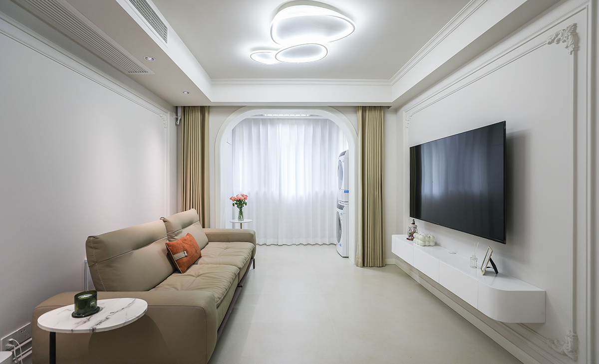 該居室女主人都是33歲左右的年輕小姐姐,生活品質要求高,喜歡簡潔清爽,見不得一點繁瑣多余的東西,對現代奶油風格有獨特理解,在造型和色彩上要求簡約而不簡單,所以該套居室整體裝修風格是現代極簡風格,電視墻和沙發墻采用PU線條做簡單造型,門洞做拱形處理,更有家的溫馨感。沙發深咖色皮質沙發,用白色茶幾搭配,體現現代風格的大氣時尚,簡潔、神秘和有質感,凸現了主人雍容華貴的氣質和非凡不俗的眼光,體現了主人優雅的內涵和高尚的審美情操。