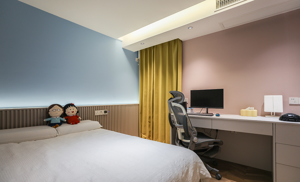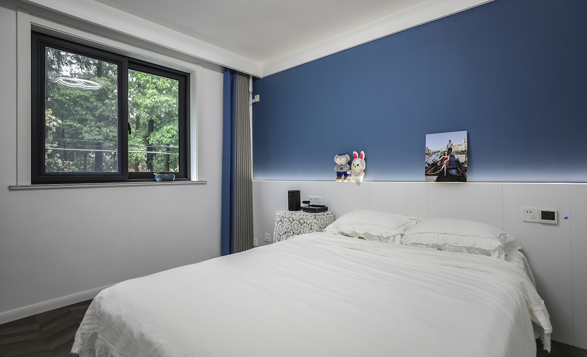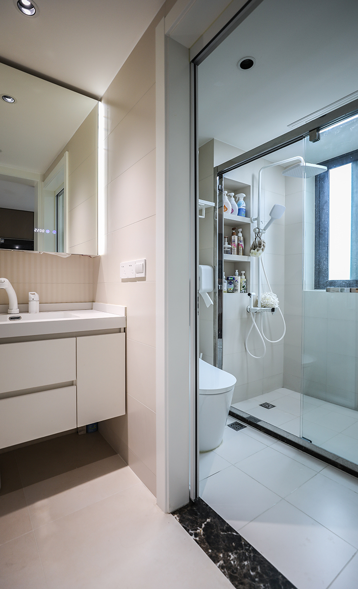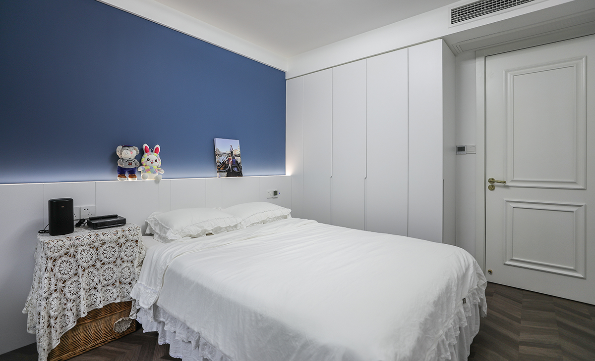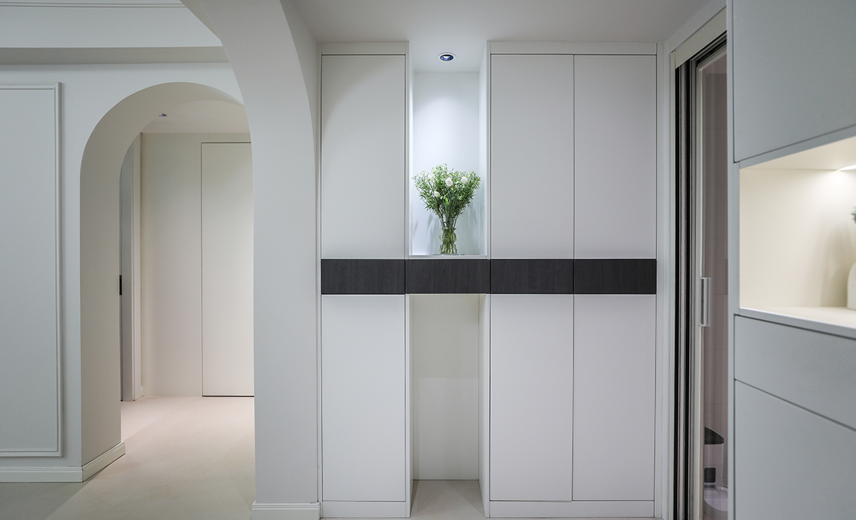 該居室女主人都是33歲左右的年輕小姐姐,生活品質要求高,喜歡簡潔清爽,見不得一點繁瑣多余的東西,對現代奶油風格有獨特理解,在造型和色彩上要求簡約而不簡單,所以該套居室整體裝修風格是現代極簡風格,電視墻和沙發墻采用PU線條做簡單造型,門洞做拱形處理,更有家的溫馨感。沙發深咖色皮質沙發,用白色茶幾搭配,體現現代風格的大氣時尚,簡潔、神秘和有質感,凸現了主人雍容華貴的氣質和非凡不俗的眼光,體現了主人優雅的內涵和高尚的審美情操。