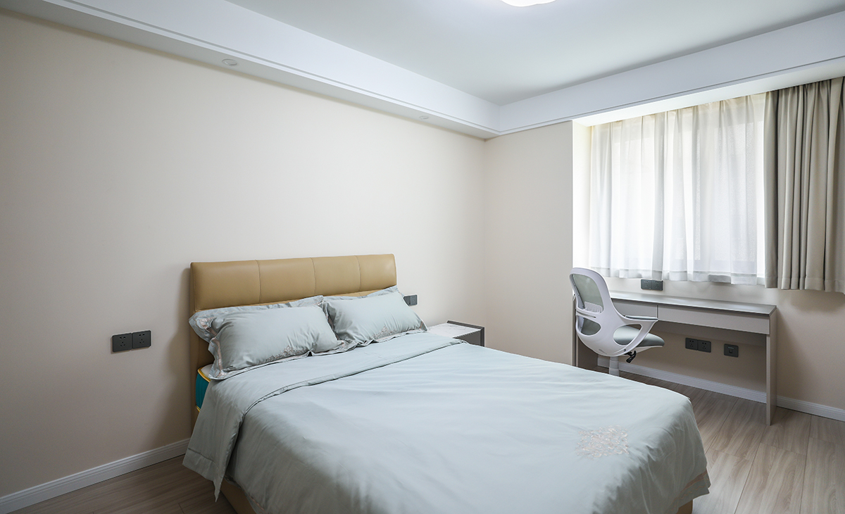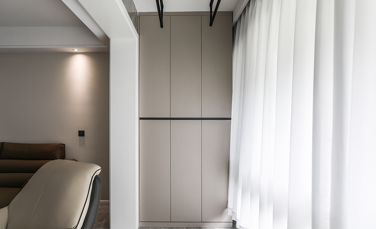 臥室做了轉(zhuǎn)角衣柜流出來的過道直角通向衣帽間,私密度更好儲物翻了一倍,色調(diào)還是以大氣的奶咖色,時尚耐看。