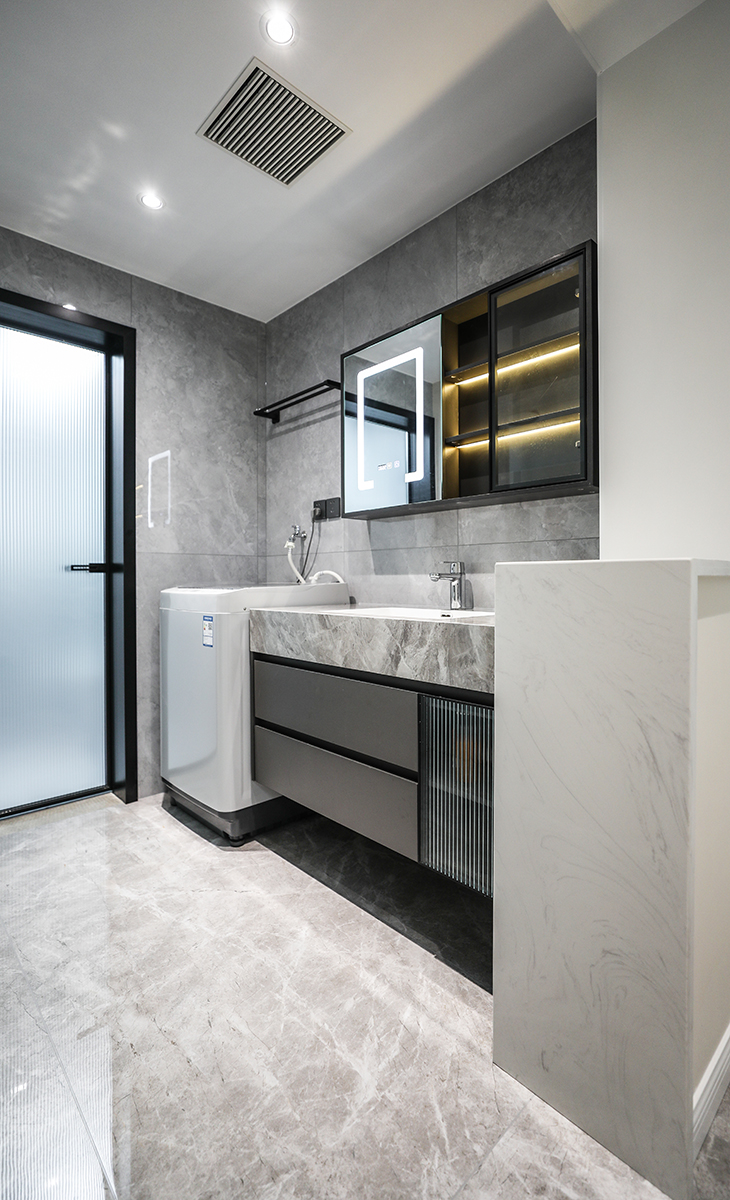 暖灰的色調(diào),干區(qū)1米的臺盆柜邊上還可以放一個備用洗衣機,衛(wèi)生間長虹超白窄邊開門,極簡的線條,600*1200的墻磚顯得衛(wèi)生間更加大氣。