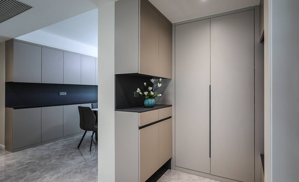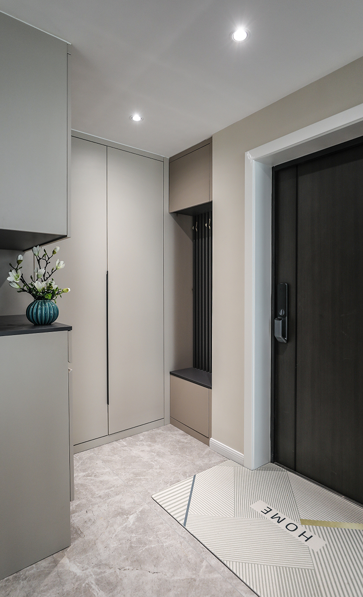 進門的多功能儲物柜絕對是房子的點睛之筆,沒有單單的做了鞋柜或者衣帽間,這樣做會顯得空間更開闊,而且儲物布局更分配合理。