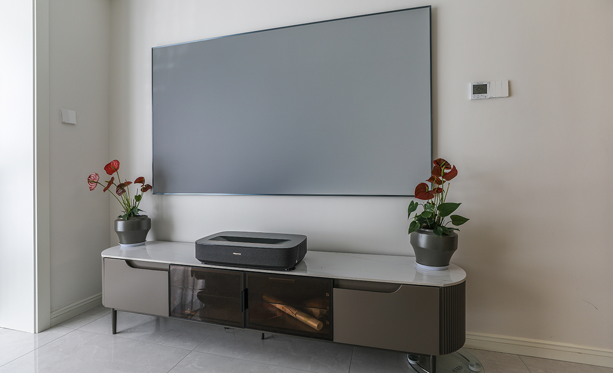 客廳開間并不大,電視墻也并不是很長,所以對于電視墻沒有做過多的裝飾,后期配上65寸的激光電視更顯簡約。暖色調一字型布藝沙發(fā)給冰冷的空間帶來一絲溫暖,吊頂造型上采用雙眼皮吊頂下邊沿嵌入線條燈,增加房屋的層次以及氛圍感。地面采用淺灰色地磚。造型和色調上無不給人以簡潔、大氣、時尚的感覺。