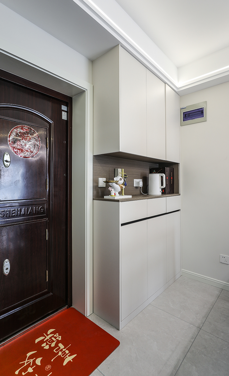 餐廳空間與門廳空間連成一體式,在進門口邊做上一組鞋柜便于業(yè)主進門更換拖鞋。而餐桌邊的裝飾柜是利用原墻體厚做的,增加了餐廳儲物以及裝飾空間。