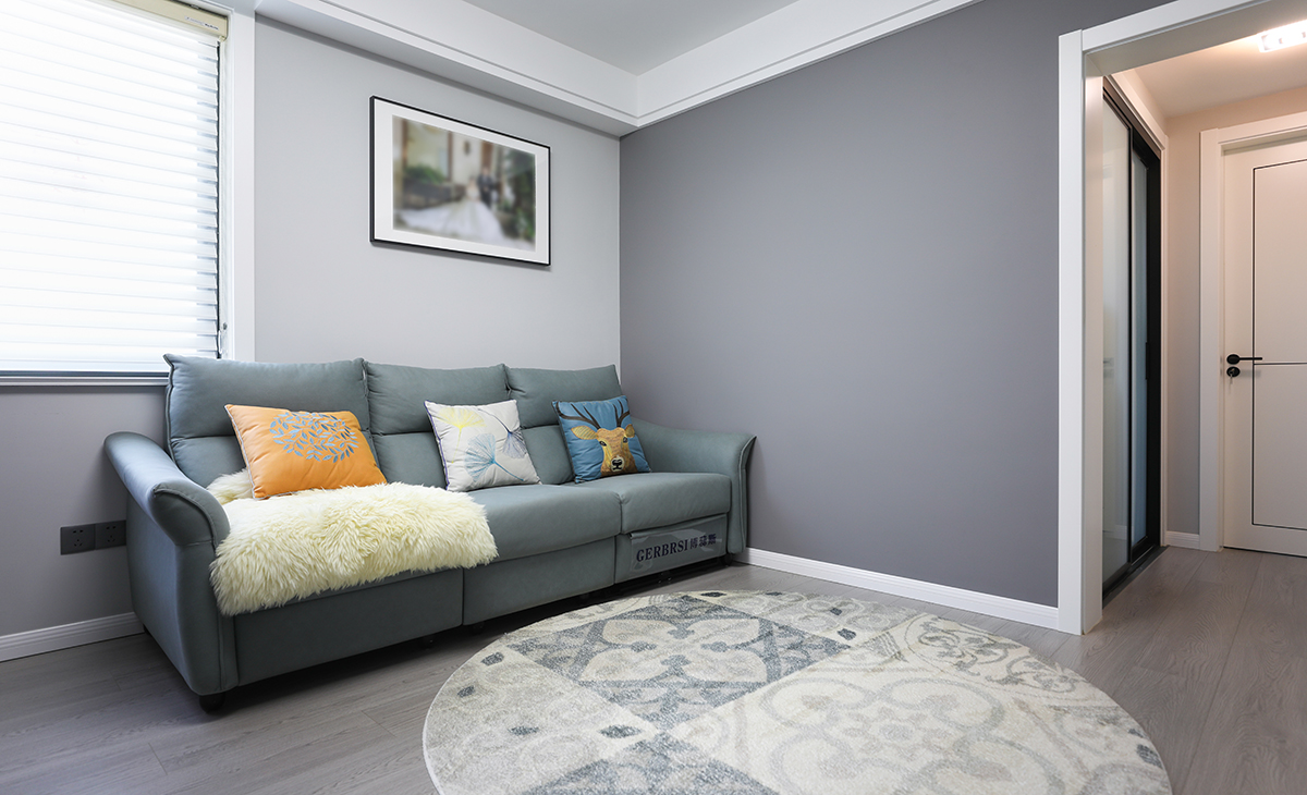 與餐椅一致原則,沙發也是采用了皮質,色調選用了灰藍色,與空間灰度一致,高雅寧靜,配合窗戶的光線靈動,簡單的空間角落既豐富又層次。