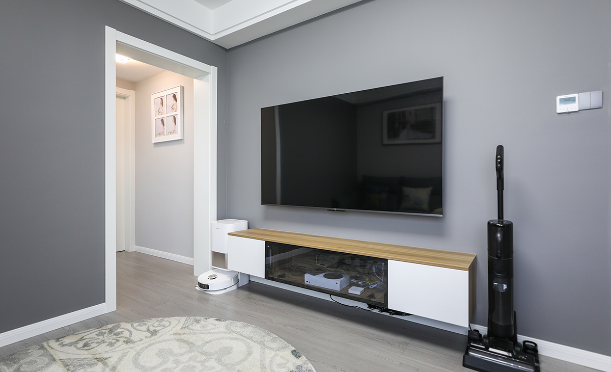整個客廳以簡約為主,主要由于客廳空間布局并不富裕,空間感通過不同灰度拉開層次,并且在局部運用了亮色作為點綴豐富場景,比如沙發上的抱枕,電視柜的木飾面,地板同樣采用灰色系,搭配地毯的材質對比,增加空間的樂趣。
