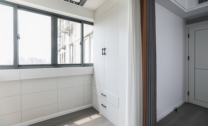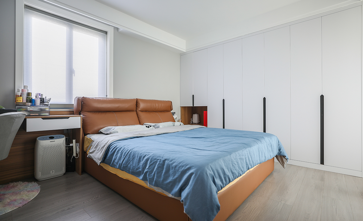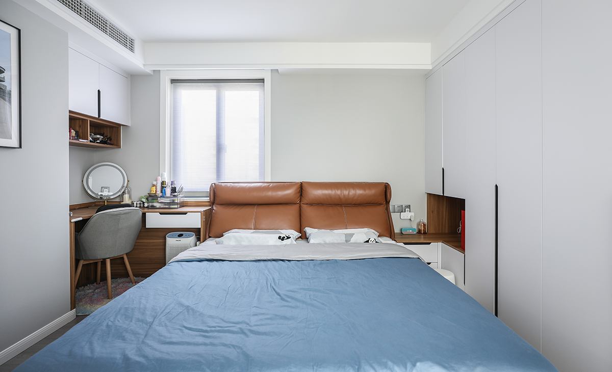 主臥基本表達的居住屬性,沒有累贅的闡述,合理利用了空間進行了再設計,墻面乳膠漆采用了更淺的灰且偏暖,著重考慮了臥室的色彩對入睡的影響,淺暖色更有助于入睡。