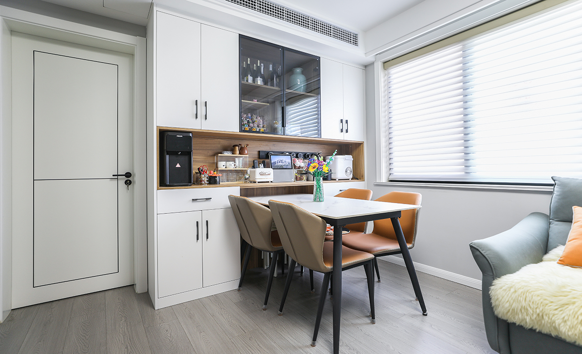 餐邊柜整體原木色搭配奶白色門板,依然主打簡約,搭配巖板的餐桌,
