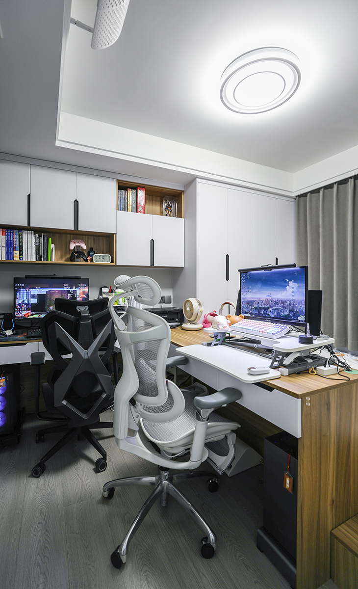 次臥是本次設計的一個亮點,整體依然屬于原木色系列,最有趣的是巧妙的把電腦區和學習區及臥室有機結合在一起,在本就不富裕的次臥做到了空間利用的最大化。