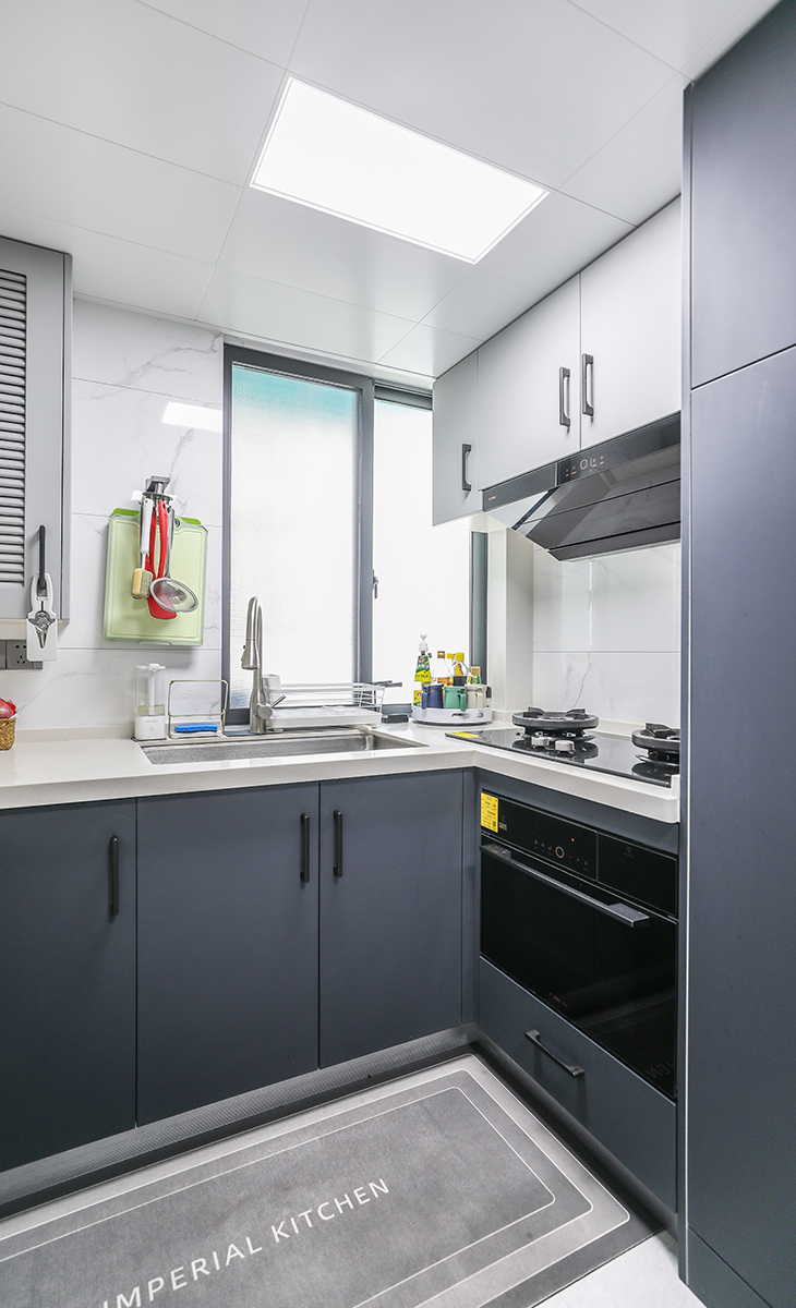 廚房空間一般,設計采用了U型操作臺,廚房操作最佳動線之一,顏色搭配上白下灰,簡約明朗,材質干凈和好打理,石英石臺面與上柜顏色遙相呼應,上端的淺色系與下柜的灰色系又形成碰撞,讓整個空間輕快許多。