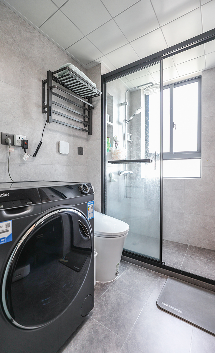 衛生間整體仍以黑白灰三色為主、不論鈦合金移門,臺盆鏡柜等基本如此,可見主人對這個色調的鐘愛,整體表現簡約優雅,寧靜致遠。