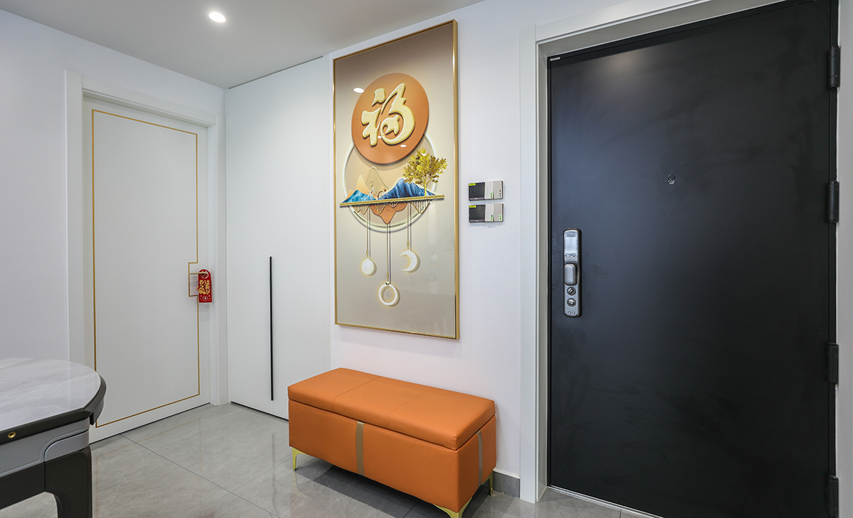 本套房子的進門玄關柜設計也是一大亮點,對外圓弧形角矮柜到內頂天立地四扇高柜,中間玻璃門,體現了主人生意人的處事圓潤,做人挺直腰桿心胸坦蕩,屏風采用金色弧形設計,和矮柜圓形角相呼應,給人感覺不僅雅致而且有韻味。