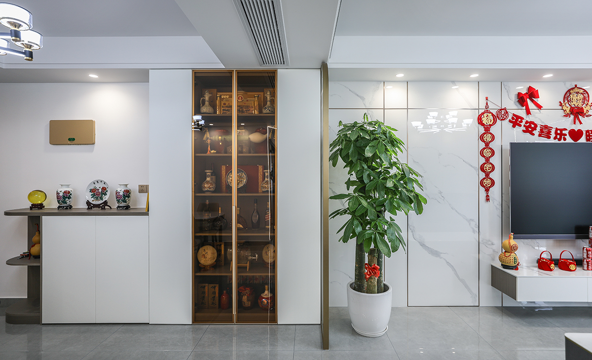 亮光石紋竹木纖維板和極窄線條將房門和背景完美集合,電視柜左邊的裝飾盆景作襯托,巖板臺面電視柜也很大氣,讓空間不但時尚而且清爽。