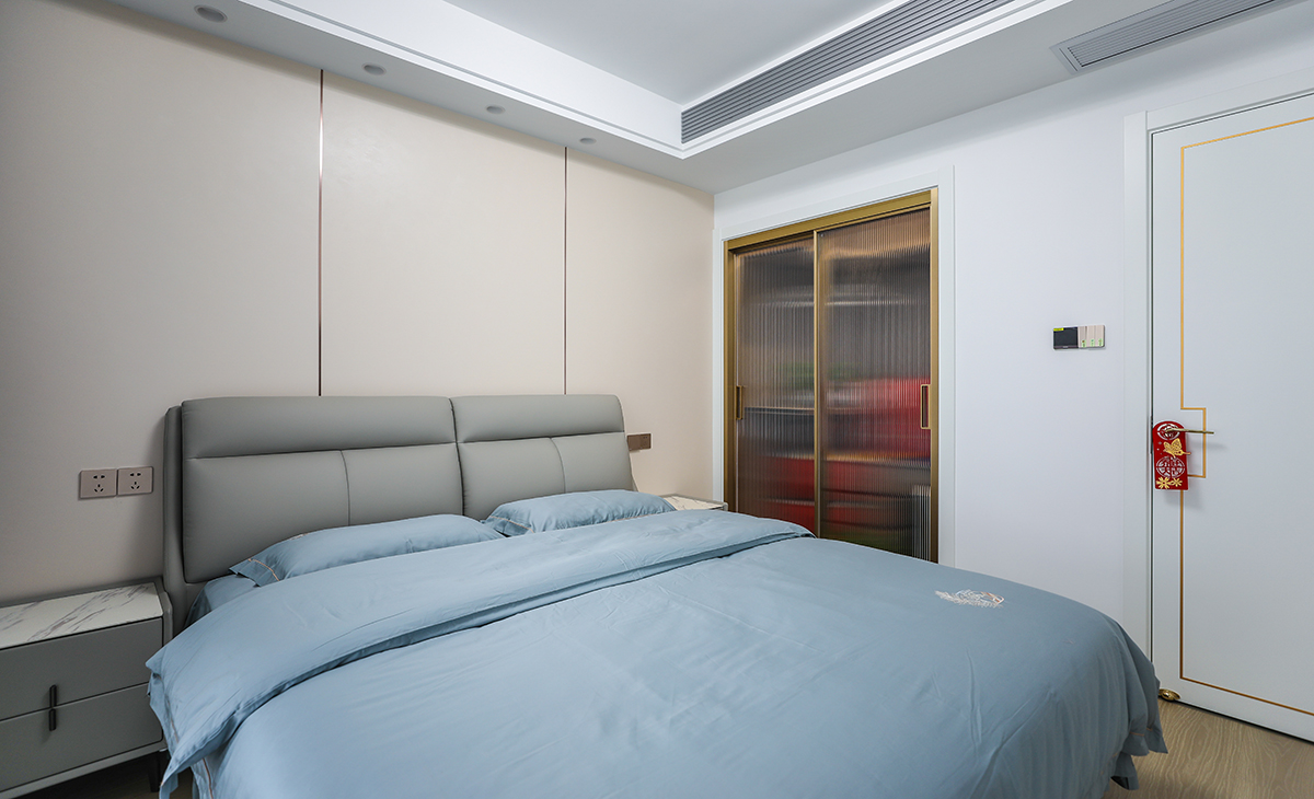 次臥是公子房,1.8米灰色皮包床保證小朋友睡覺充足翻身空間,睡的安心,衣柜區域正對進門區做一排玻璃門,里面可以放小朋友的玩具和書本,床頭背景墻米白色結合淺灰色竹木纖維墻板,既讓奶白色柜門和墻面、頂面渾然一體,同時呼應了灰色床、床頭柜,整個次臥看起來高大尚。