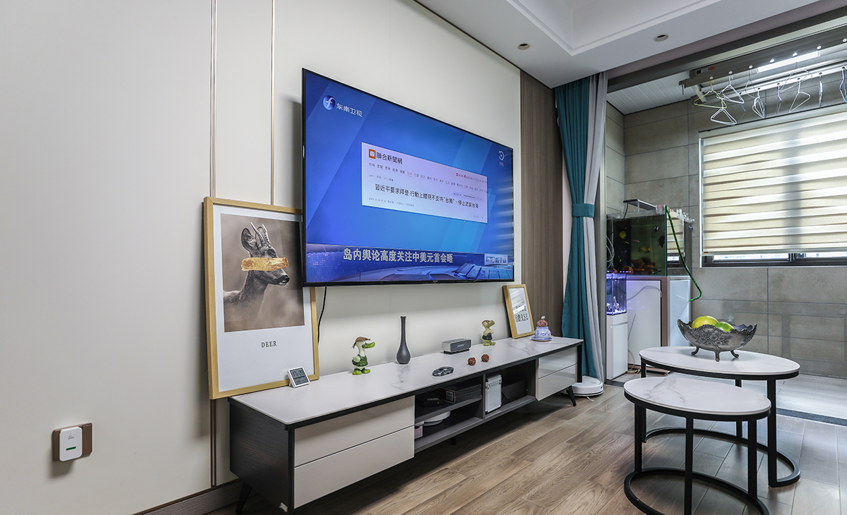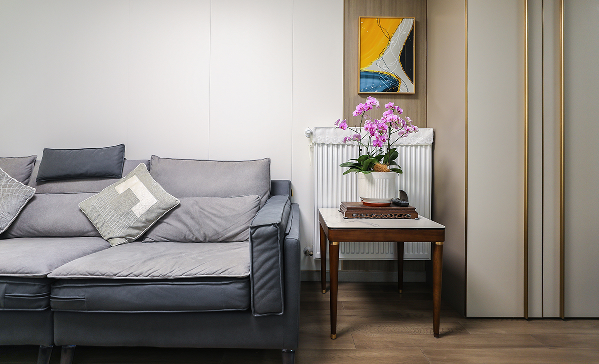 沙發(fā)背景墻也是采用纖維大板材質(zhì),用純色和木色進(jìn)行簡單拼接,沙發(fā)邊放上一個邊幾,放置裝飾花瓶和掛畫,作為點(diǎn)綴,讓整個空間變得更加靈動。